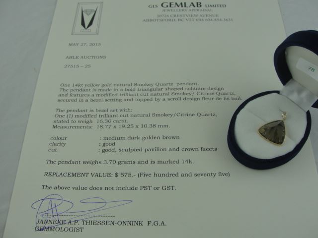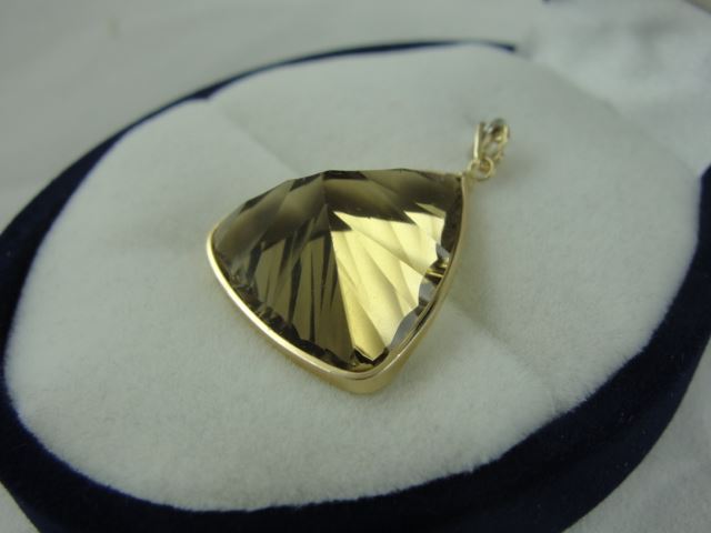 14KT YELLOW GOLD NATURAL SMOKEY QUARTZ PENDANT WITH ONE SMOKEY/ CITRINE QUARTZ, APPROX 16.30CARAT REPLACEMENT VALUE $575