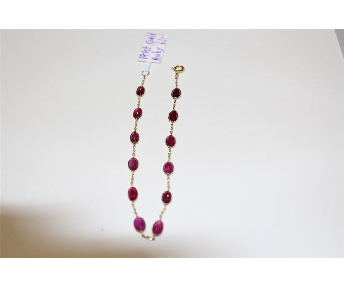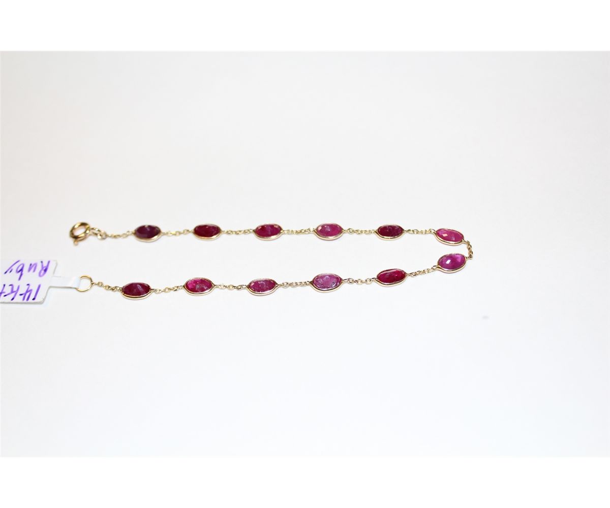 14KT. YELLOW GOLD RUBY BRACELET SET WITH 12 OVAL MIXED CUT RUBIES APPROX. 6.10 CARATS. REPLACEMENT VALUE: $1100.00