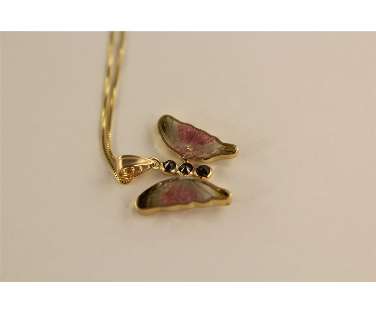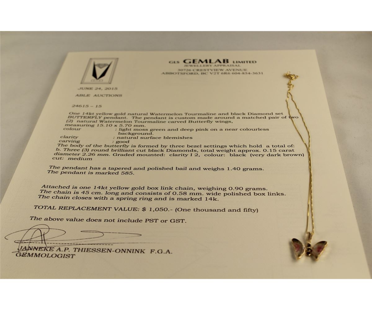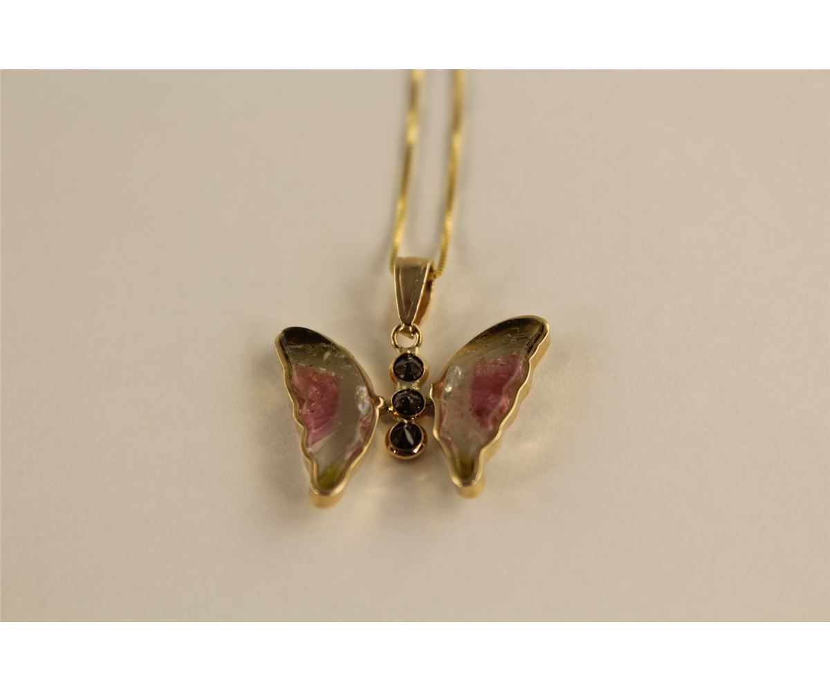 14KT YELLOW GOLD, TOURMALINE & BLACK DIAMOND SET BUTTERFLY PENDANT.WINGS ARE CUSTOM MADE MATCHED PAIR OF NATURAL WATERMELON TOUMALINE, BODY IS 3 ROUND BRILLIANT CUT BLACK DIAMONDS APPROX. 0.15 CARATS.  ATTACHED IS A 14KT YELLOW GOLD BOX LINK CHAIN 45CM LONG.  REPLACEMENT VALUE:$1050.00