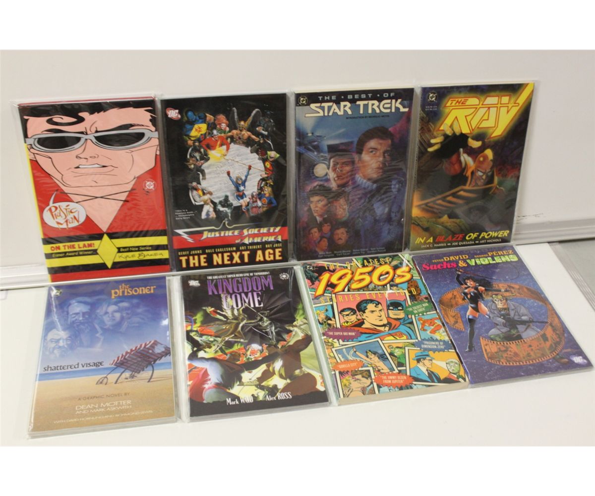 15 DC TRADE PAPERBACKS, ALL DIFFERENT. VARIOUS, OUT OF PRINT & NEW. HIGH GRADE.