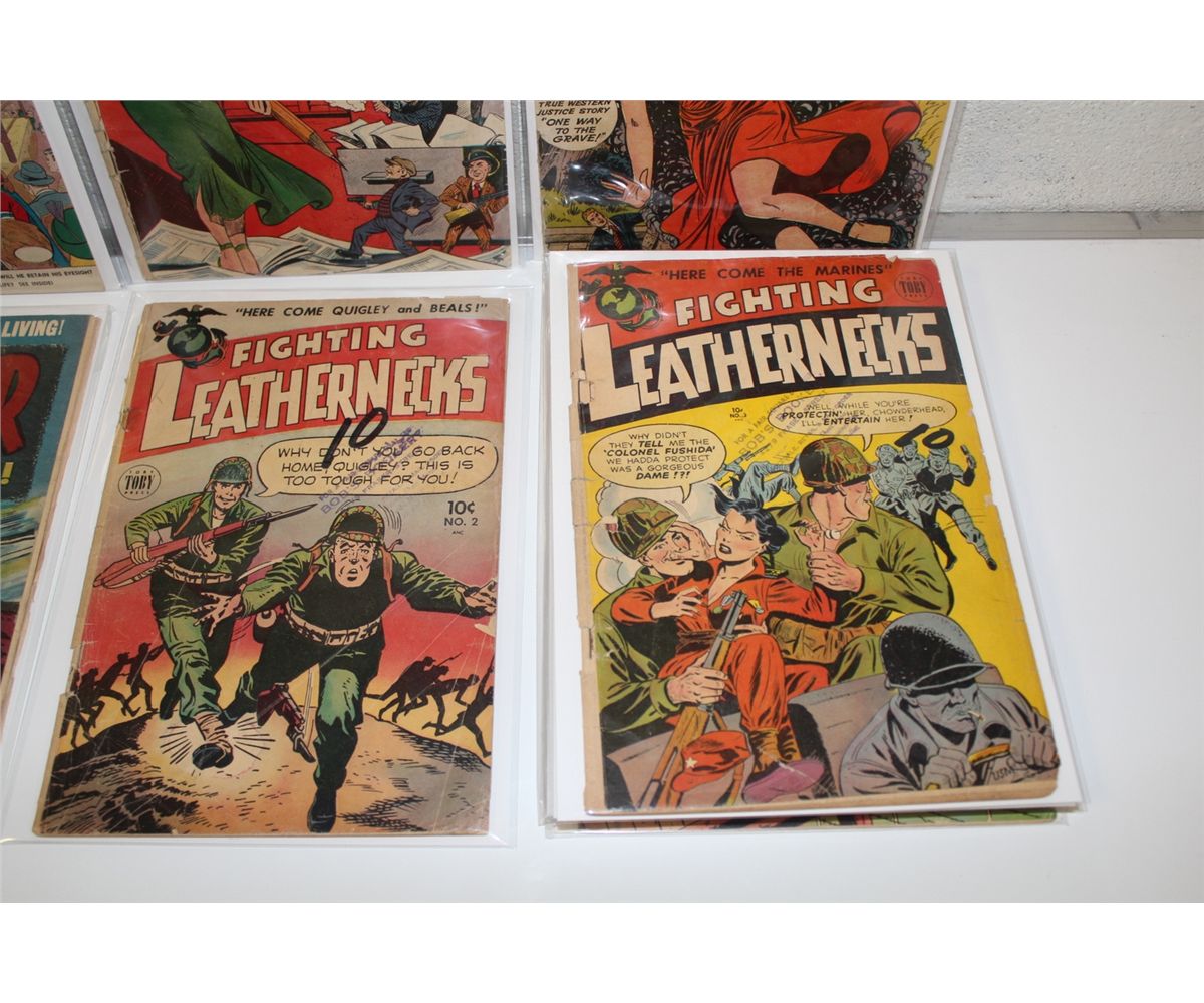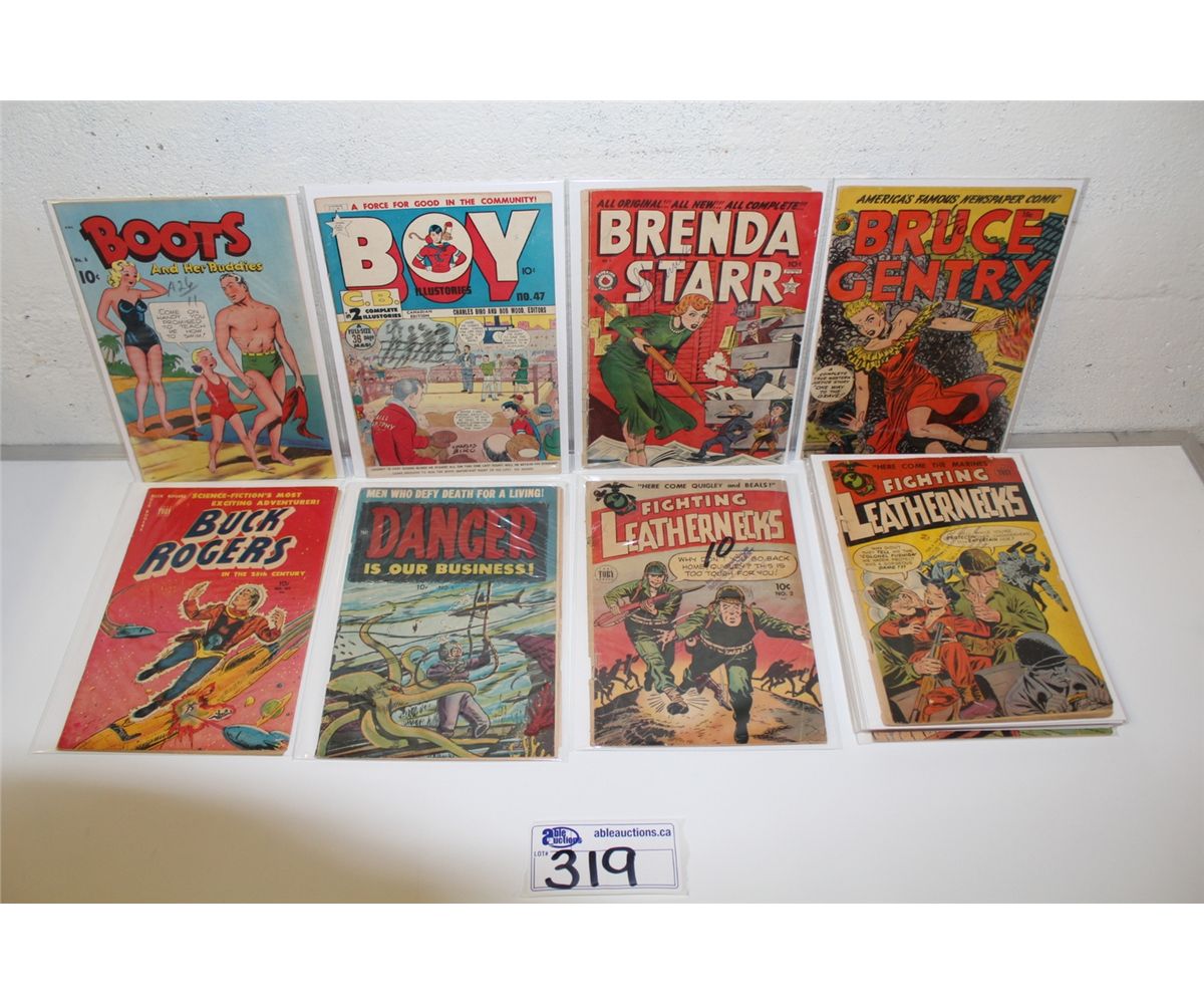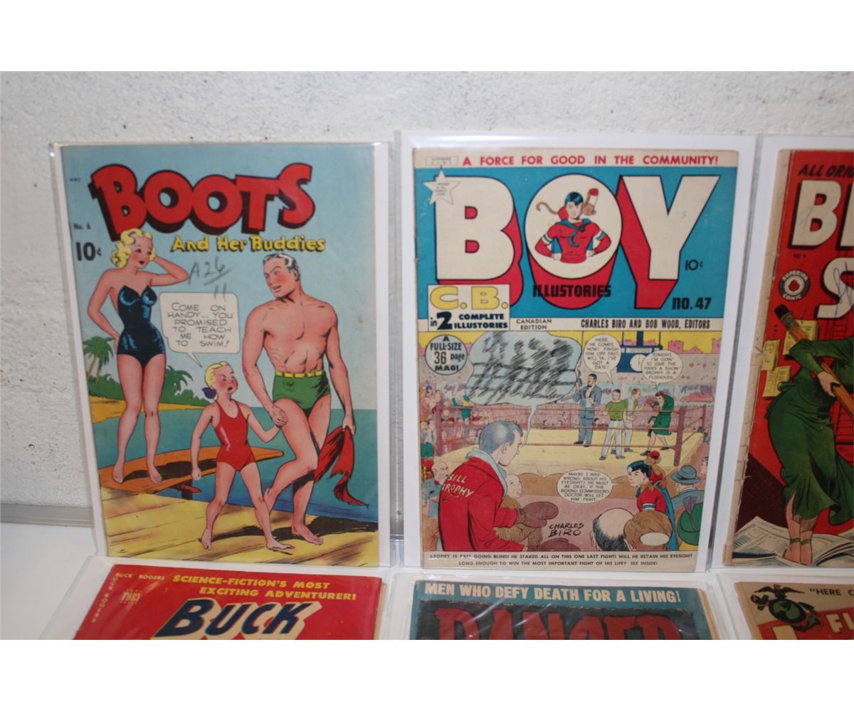 15 MISCELLANEOUS GOLDEN AGE CANADIAN EDITION COMICS. (1940'S-50'S) INCLUDES DANGER IS OUR BUSINESS! #1, LATEST COMICS #1, U.S. MARINES IN ACTION #1, ETC. LOW TO MID GRADE AVERAGE SOLID & COMPLETE LOT.