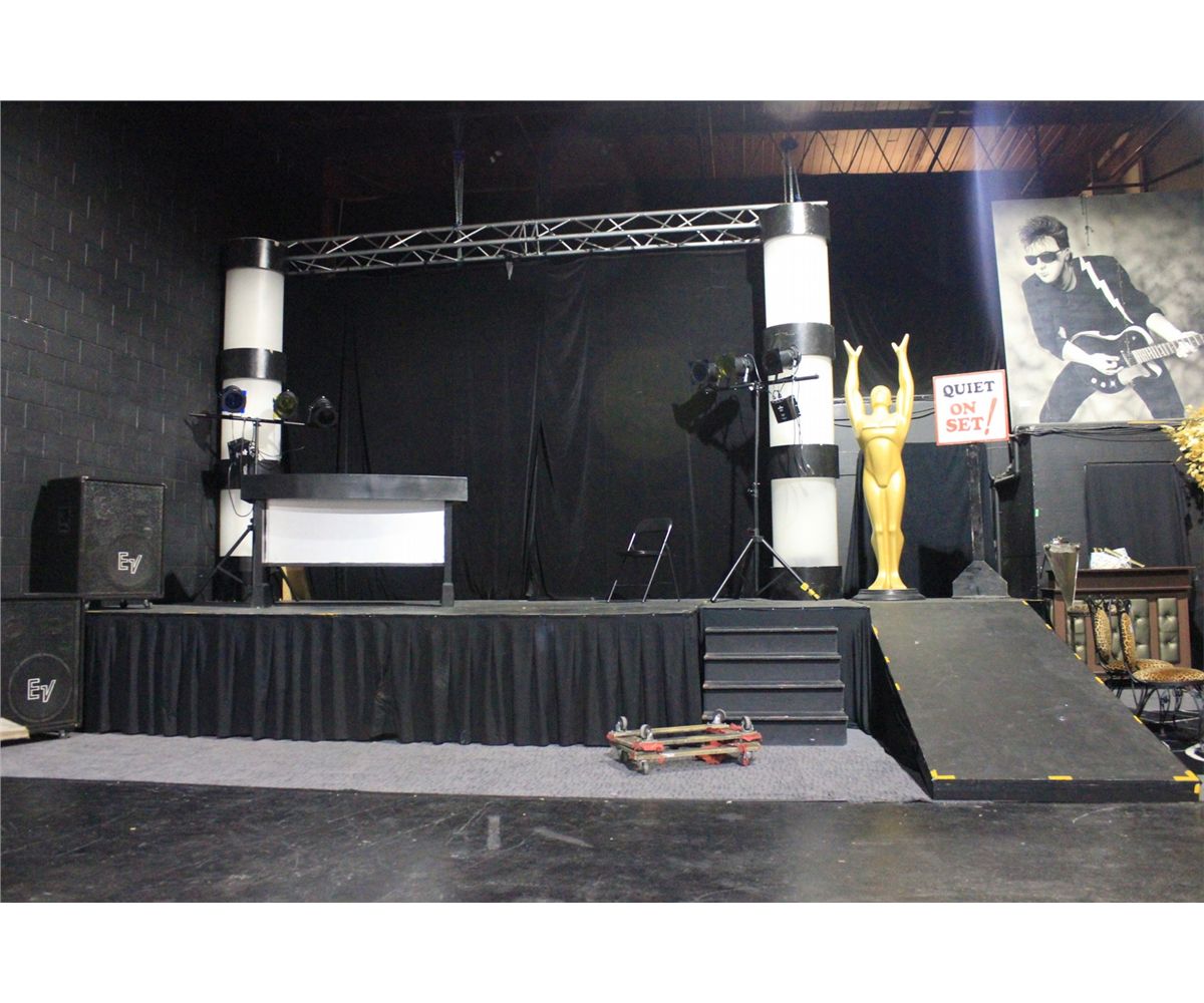 16' X 12' PROFESSIONAL 7 PIECE STAGE WITH RAMP, PLATFORM, CURTAIN, LIGHTING BAR, LIGHT UP COLUMNS,