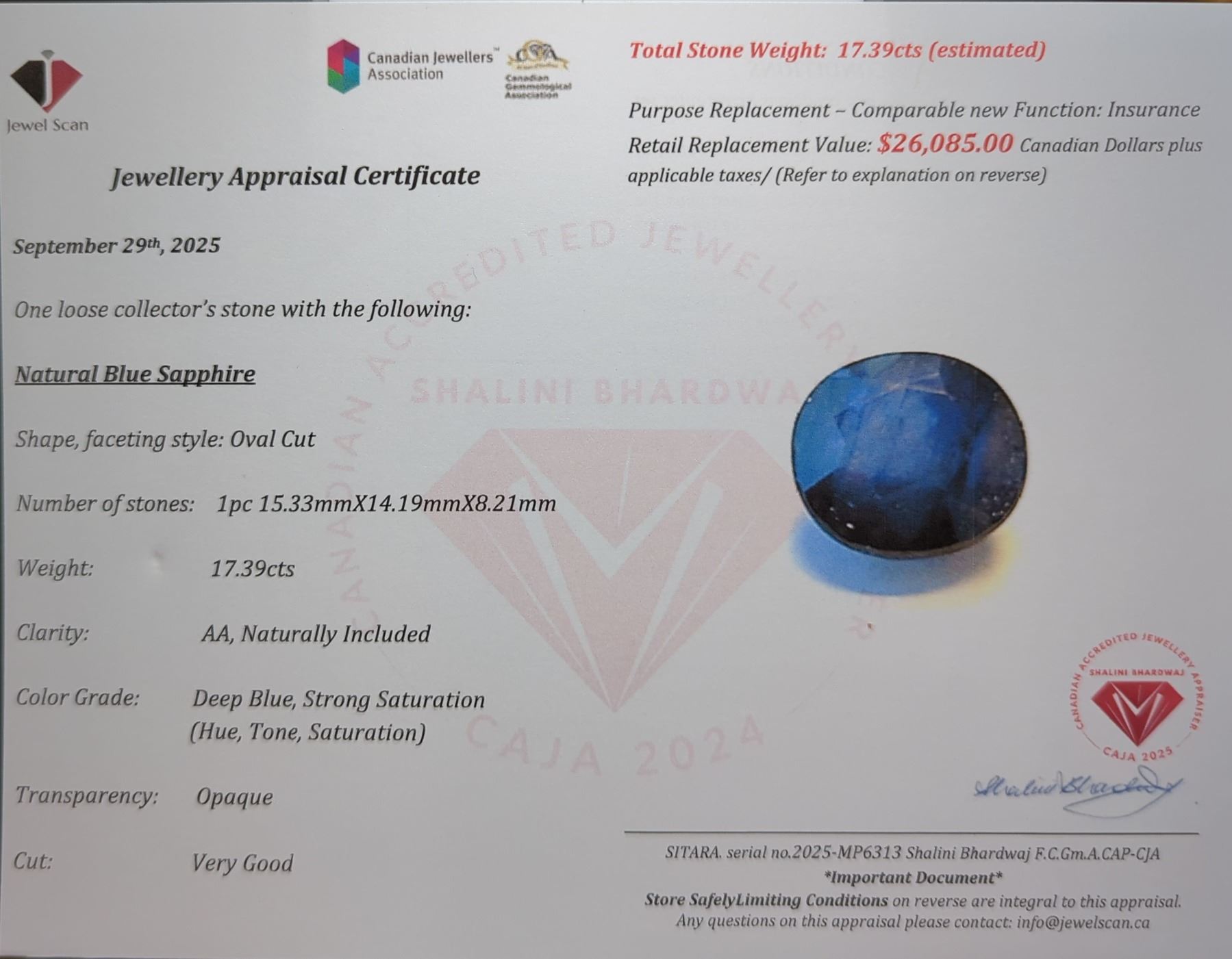 17.39 CT CERTIFIED MIDNIGHT SAPPHIRE GEMSTONE ($26,085 APPRAISAL, APPRAISAL NOT GUARANTEED)