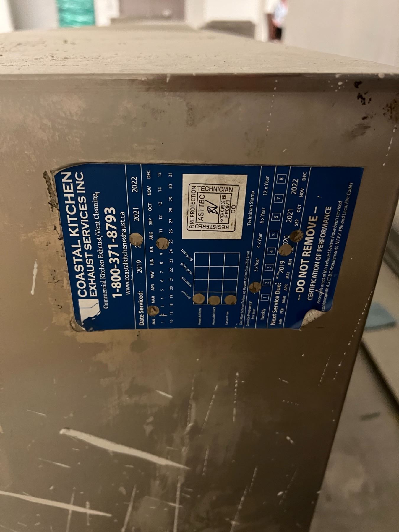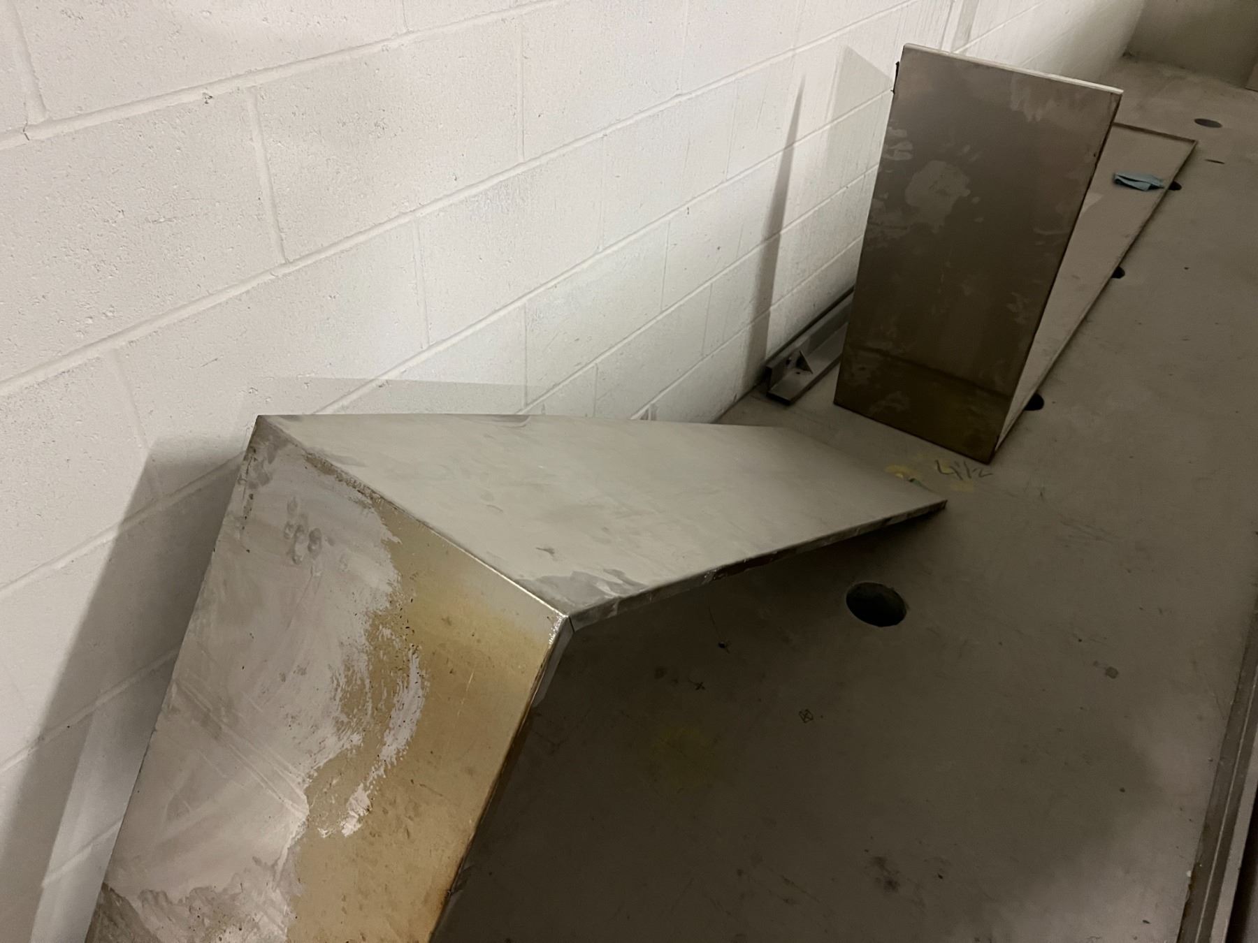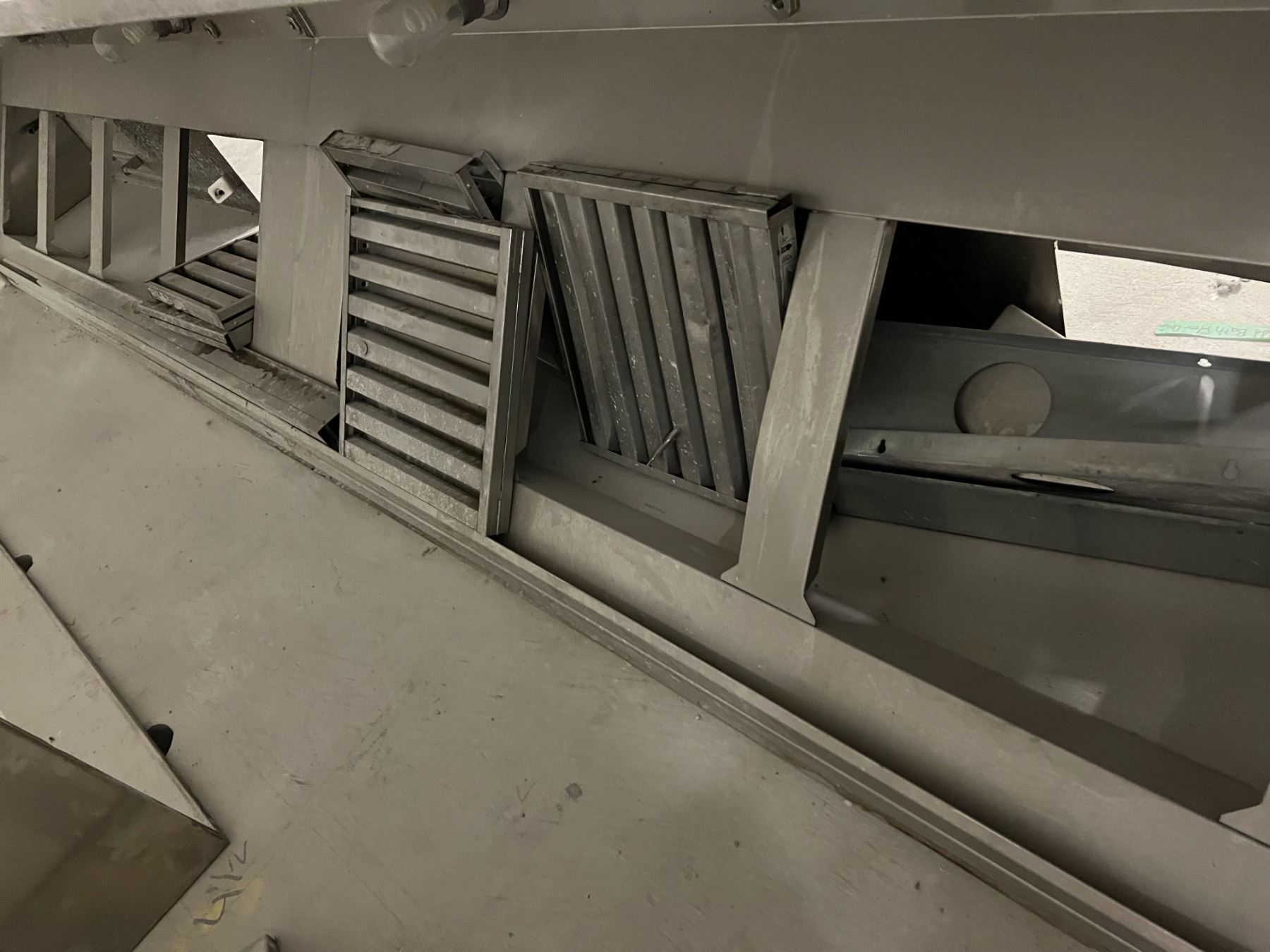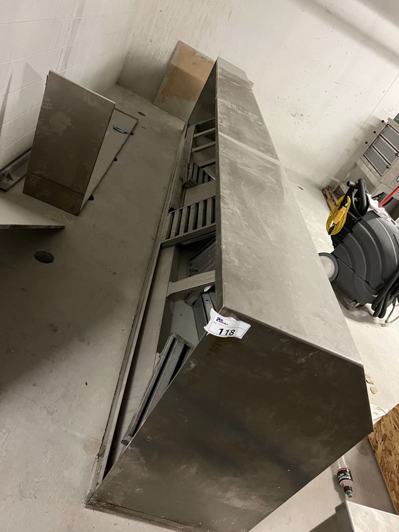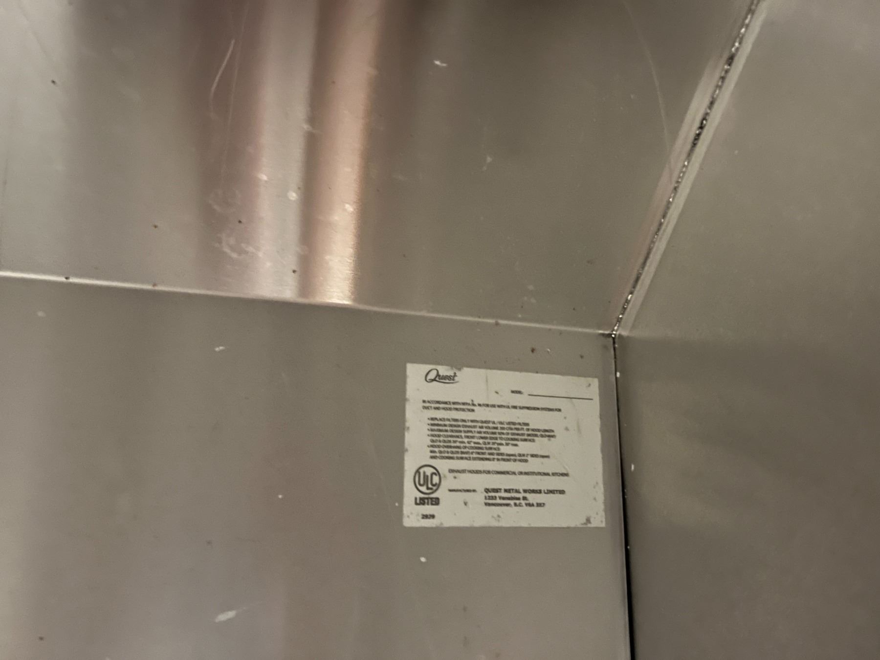 17' LONG STAINLESS STEEL EXHAUST HOOD. 42" DEEP. MANUFACTURED BY QUEST. SEALED LIGHTS. PLUMBED FOR FIRE SUPPRESSION. HAS ALL SCREENS AND INC HANGERS AND EXTRA SHROUDING