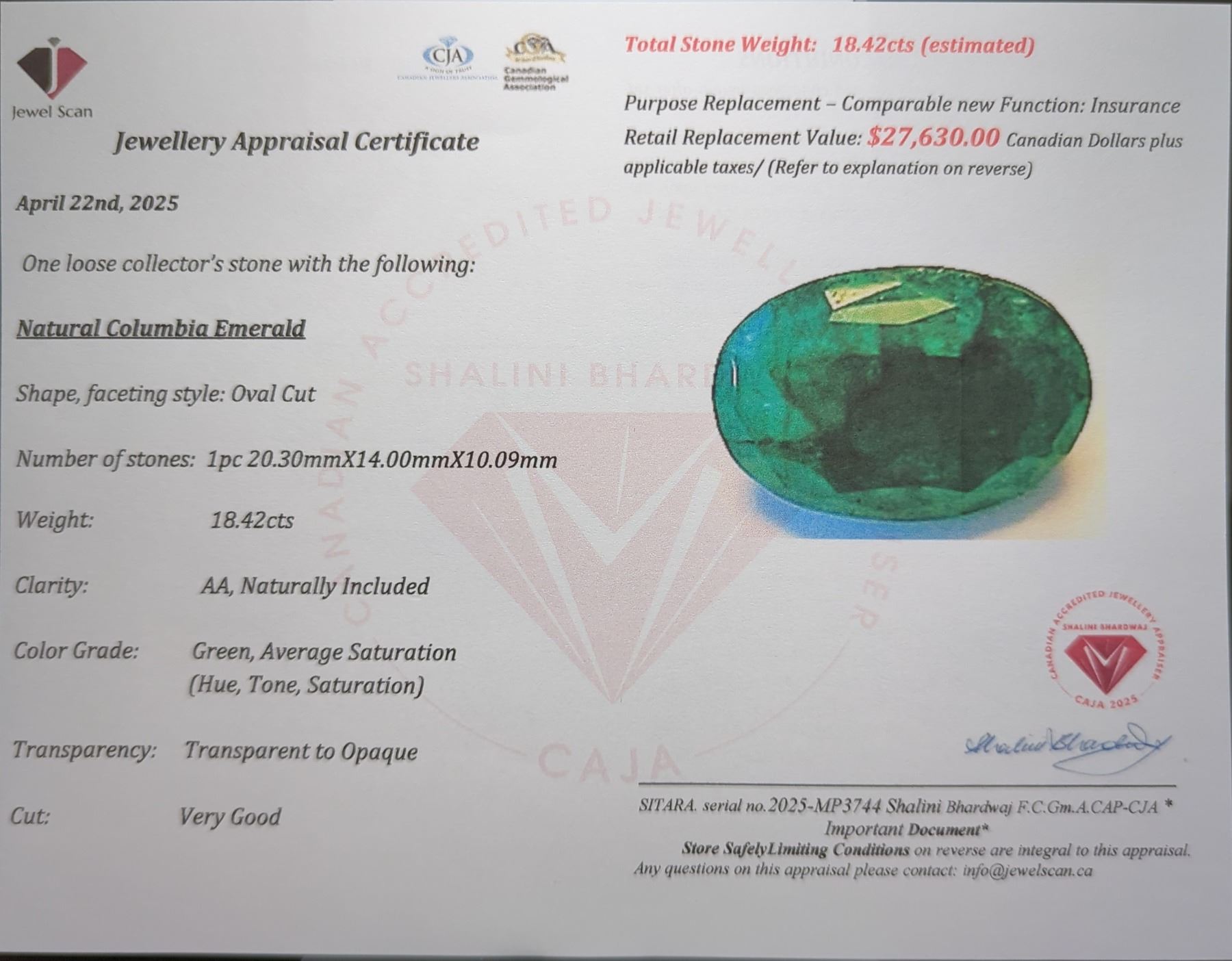 18.42 CT CERTIFIED COLOMBIAN EMERALD GEMSTONE ($27,630 APPRAISAL, APPRAISAL NOT GUARANTEED)