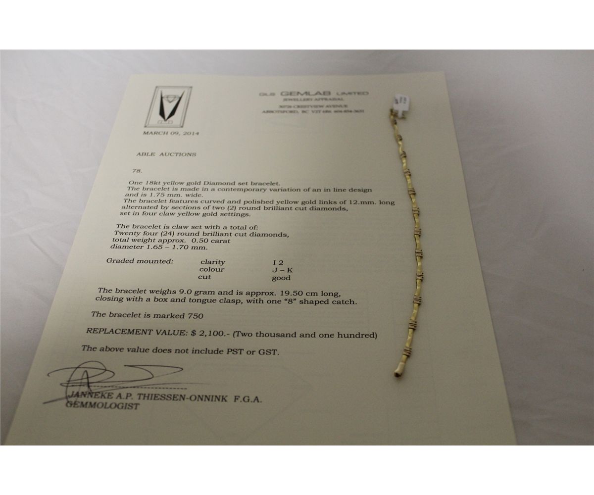 18 KT. YELLOW GOLD DIAMOND SET BRACELET.  CLAW SET WITH A TOTAL OF 24 ROUND BRILLIANT CUT DIAMONDS APPROX. 0.50 CARATS.  REPLACEMENT VALUE $2100.00