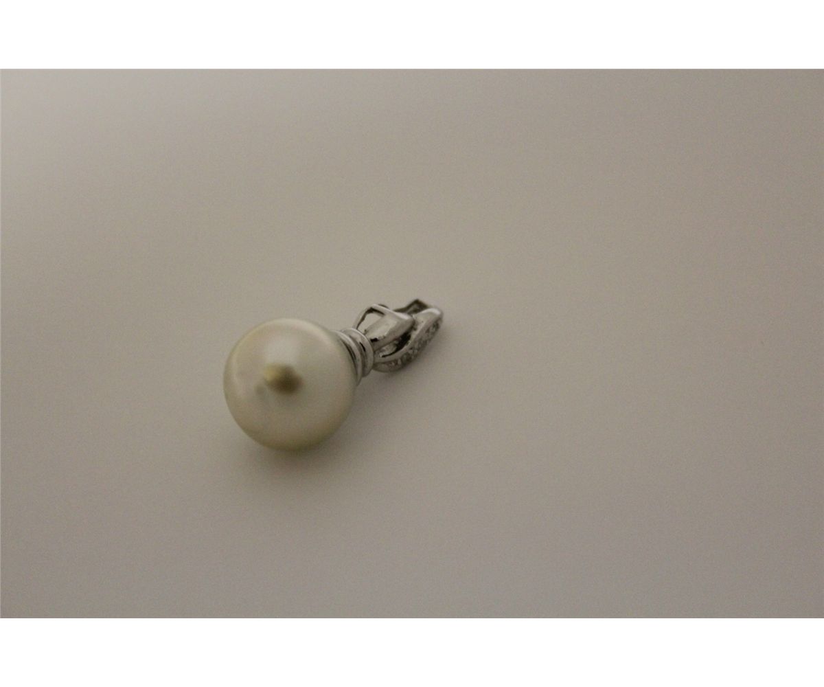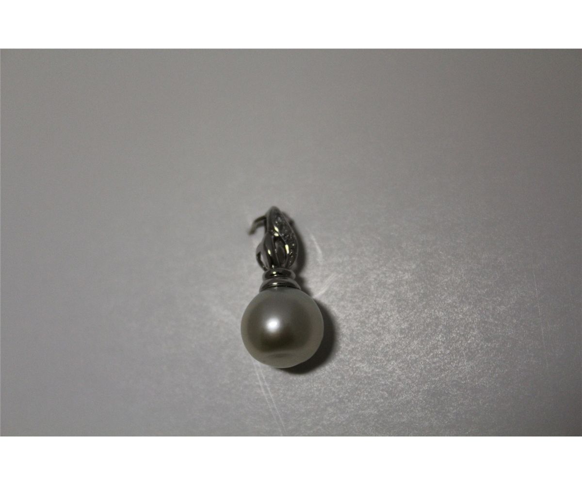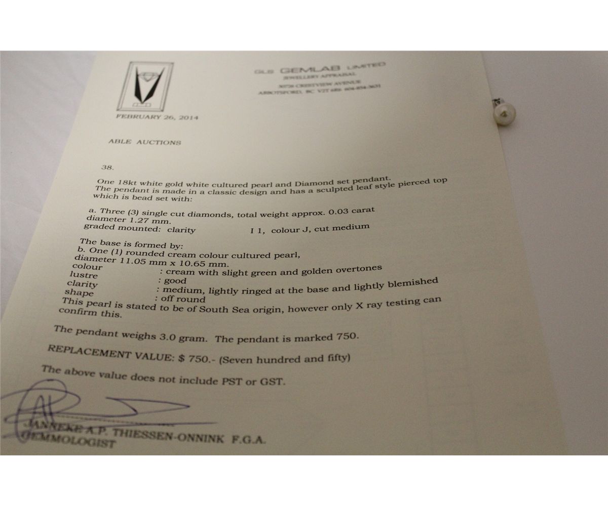 18KT. WHITE GOLD WITH CULTURED PEARL & DIAMOND SET PENDANT. CLASSIC DESIGN HAS A SCULPTED LEAF STYLE PIERCED TOP, BEAD SET WITH 3 SINGLE CUT DIAMONDS APPROX. 0.03 CARATS. REPLACEMENT VALUE $750.