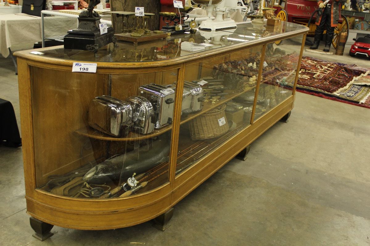 1930S OAK 11.5' CURVED GLASS STORE DISPLAY CASE