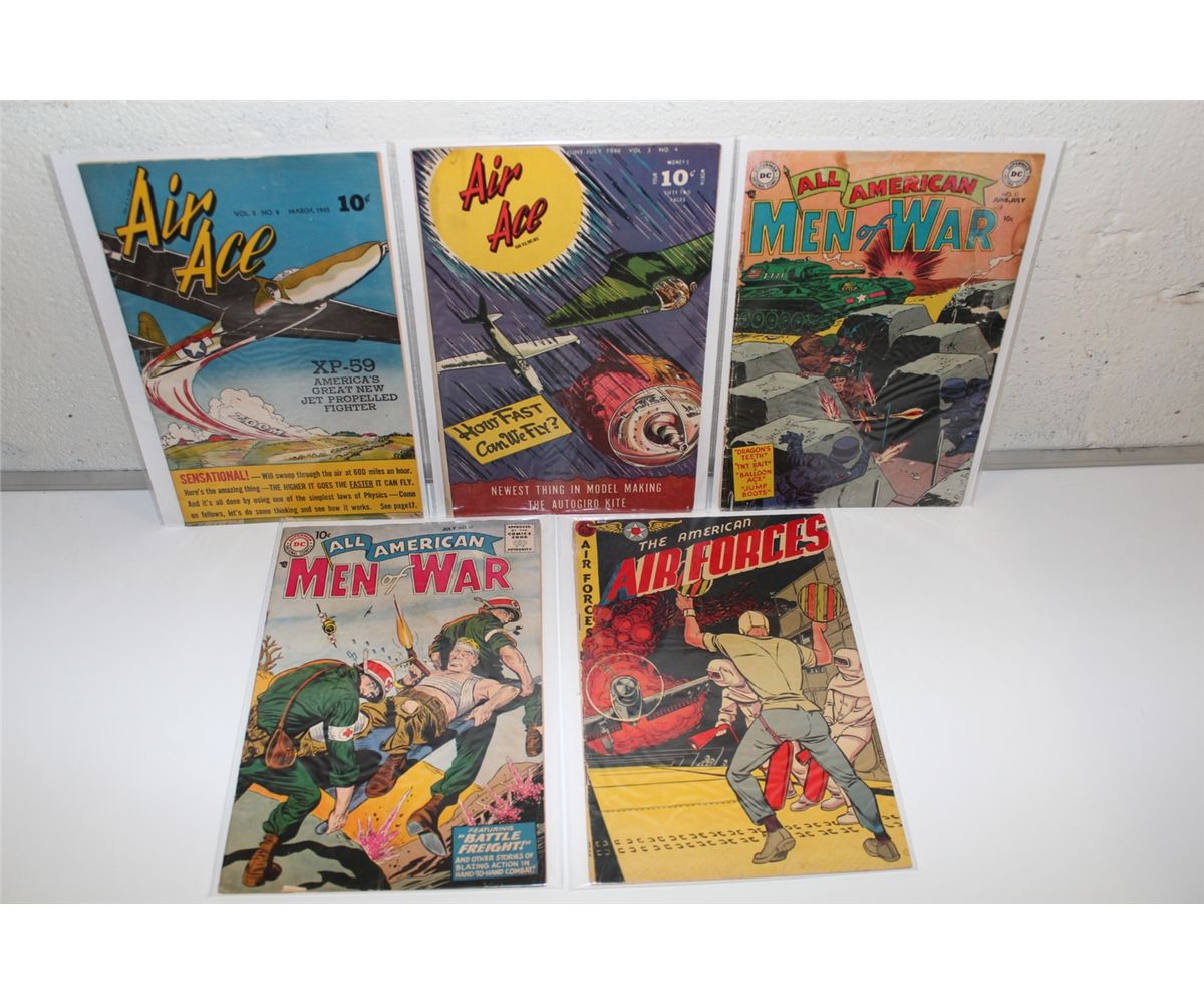 1940'S & 50'S GOLDEN AGE PRECODE WAR LOT (1945-57) INCLUDES AIR ACE VOL.2 #8 & VOL.3 #4, AMERICAN AIR FORCES #12 & ALL AMERICAN MEN OF WAR #11 & 47. 5 BOOKS TOTAL, LOW TO MID GRADE AVERAGE, NICE & SOLID.