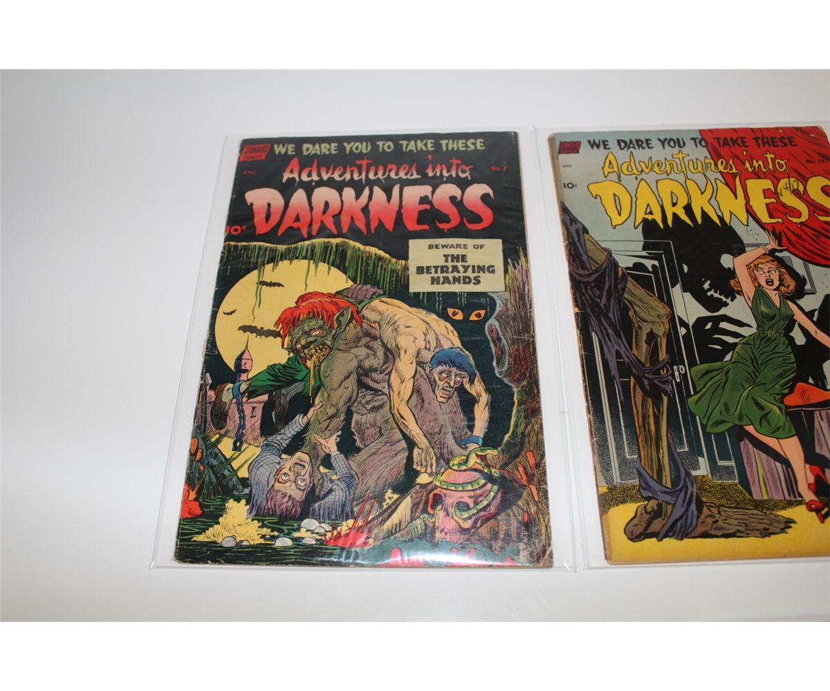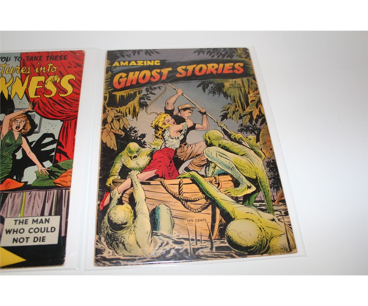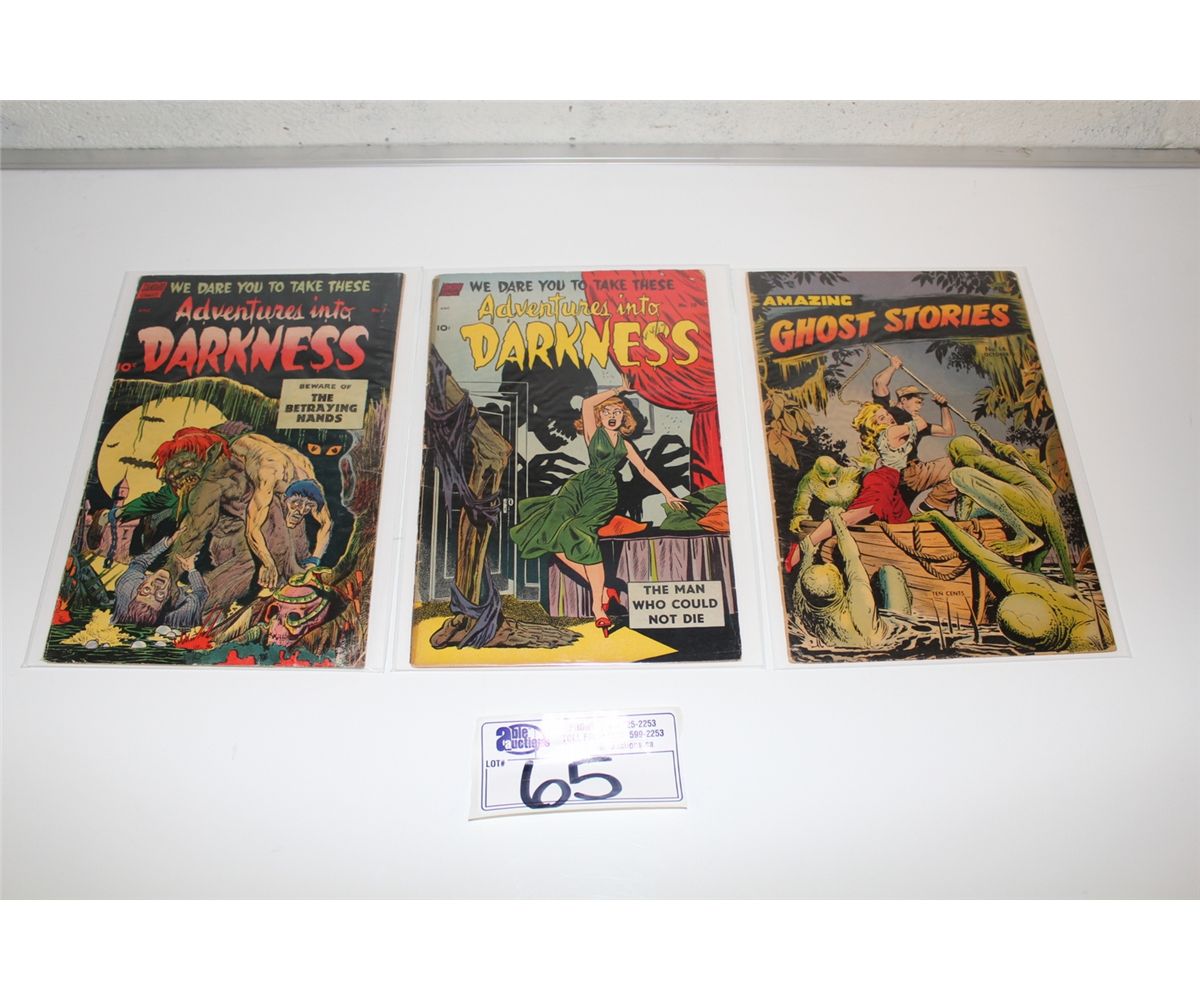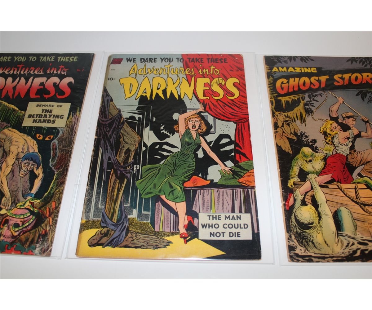 1950'S PRECODE HORROR LOT INCLUDES ADVENTURES INTO DARKNESS # 7 & 10 (1952) & AMAZING GHOST STORIES #14 (1954) BAKER COVER. LOWER GRADE AVERAGE, NICE & SOLID.