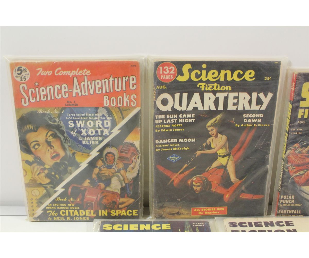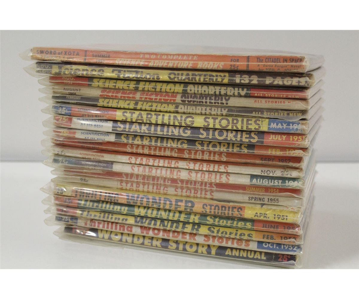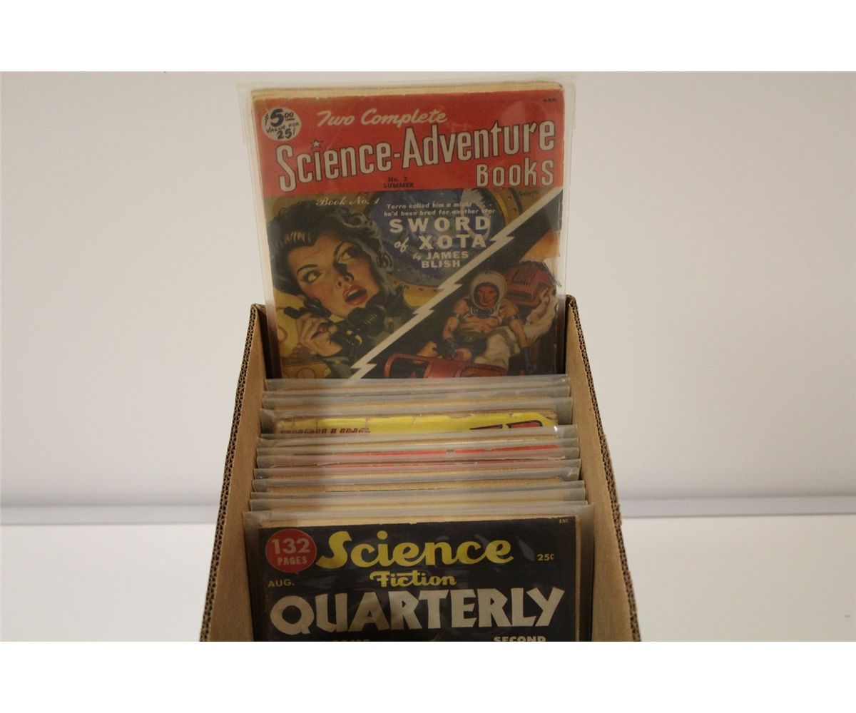 1950'S SCIENCE-FICTION PULP RUNS SHORT BOX (1950-57) INCLUDES SCIENCE-ADVENTURE BOOKS (1 ISSUE), SCIENCE-FICTION QUARTERLY (4 ISSUES), STARTLING STORIES (8 ISSUES) & THRILLING WONDER STORIES (5 ISSUES) I8 PULPS TOTAL NO DUPLICATES, SHARP, ABOVE AVERAGE CONDITION FOR 50-60+ YEAR OLD PULPS WITH SUPPLE PAGES, DEEP COLOURS & NICE SPINES! CHOICE BOX!