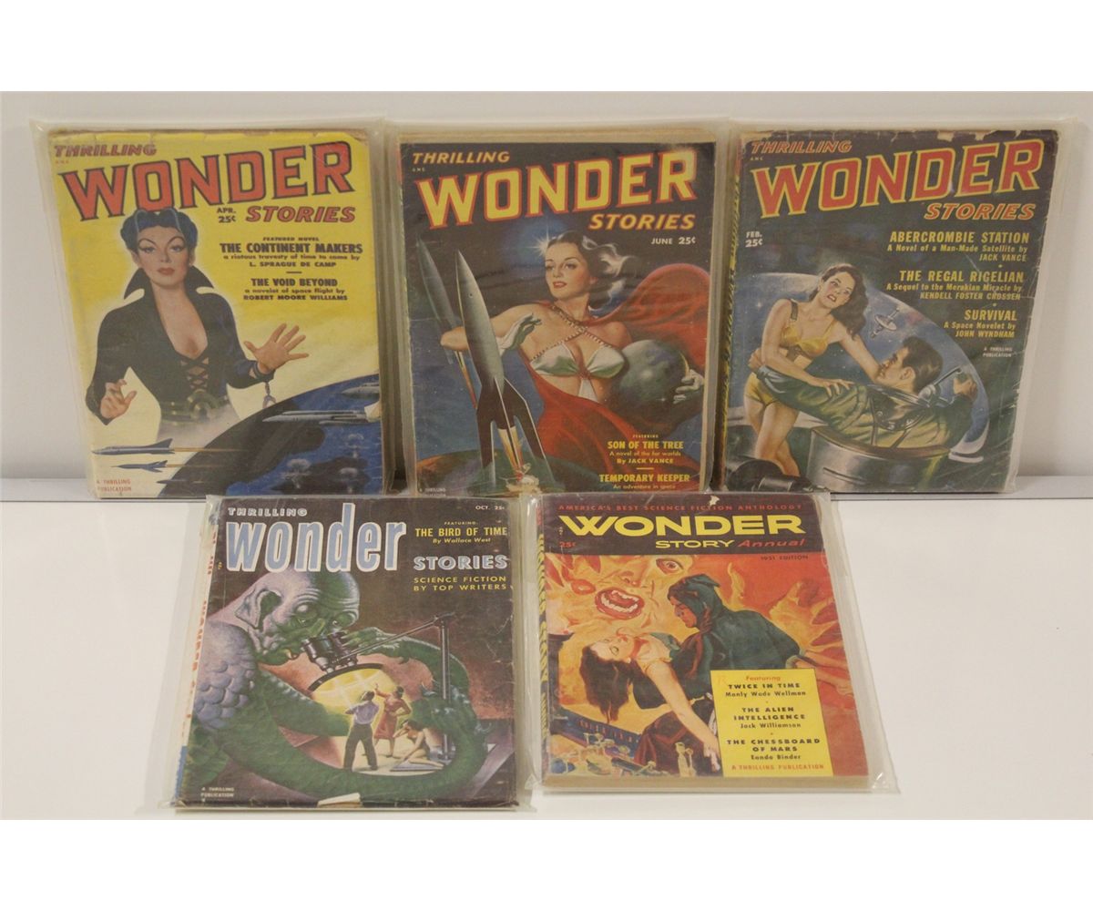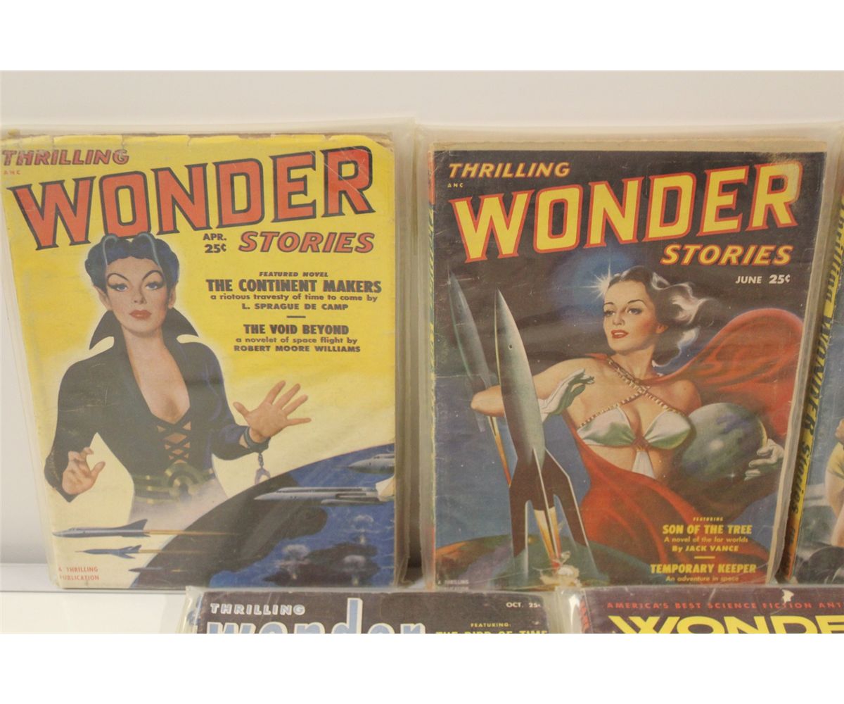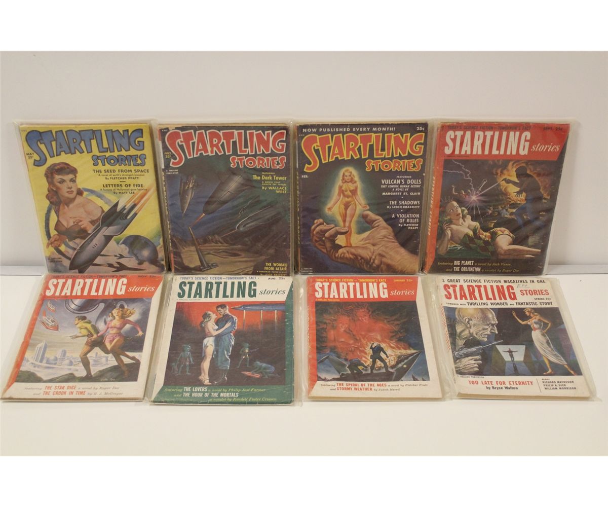 1950'S SCIENCE-FICTION PULP RUNS SHORT BOX (1950-57) INCLUDES SCIENCE-ADVENTURE BOOKS (1 ISSUE), SCIENCE-FICTION QUARTERLY (4 ISSUES), STARTLING STORIES (8 ISSUES) & THRILLING WONDER STORIES (5 ISSUES) I8 PULPS TOTAL NO DUPLICATES, SHARP, ABOVE AVERAGE CONDITION FOR 50-60+ YEAR OLD PULPS WITH SUPPLE PAGES, DEEP COLOURS & NICE SPINES! CHOICE BOX!