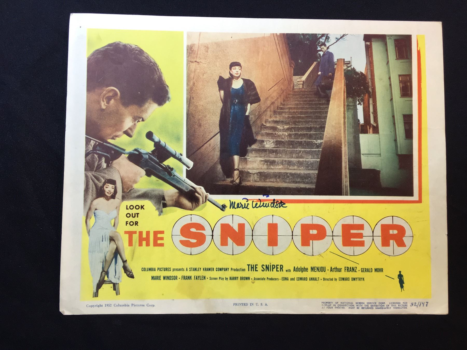 1952 "THE SNIPER" LOBBY SCENE CARD, SIGNED BY MARIE WINDSOR