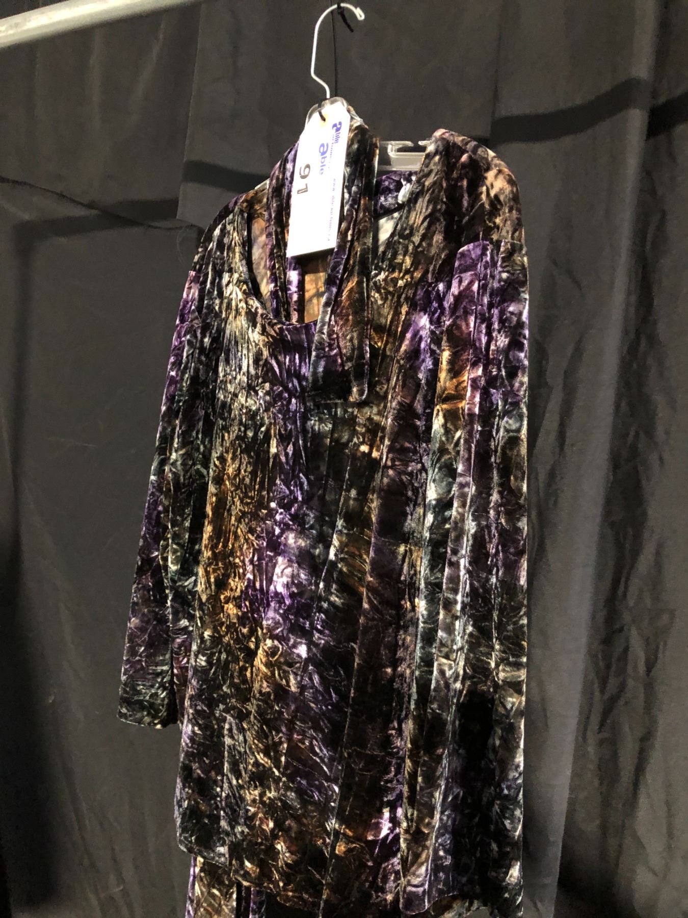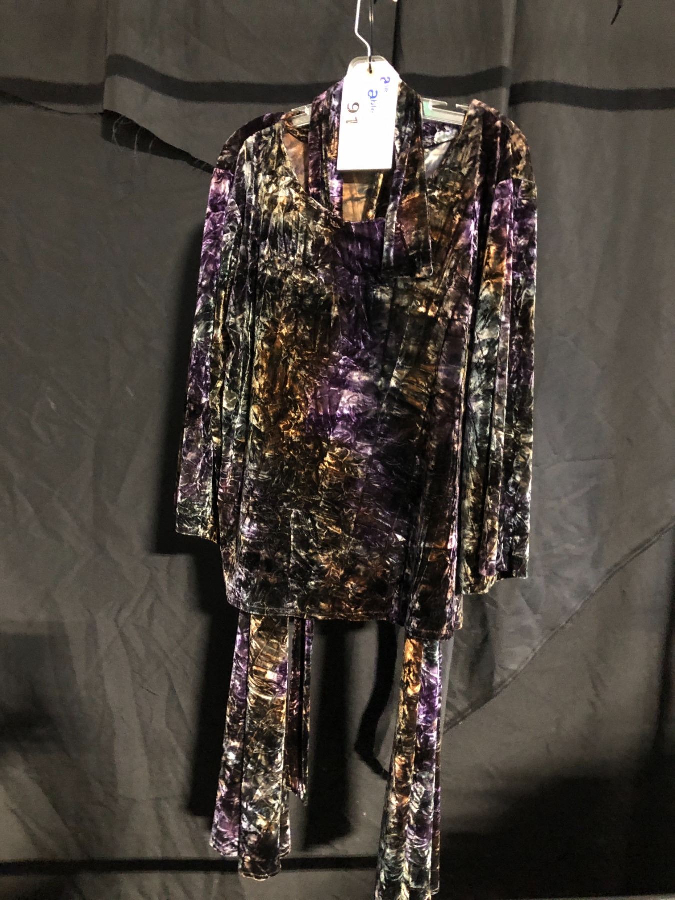 1960'S PURPLE PATTERN VELVET PANTS SUIT, DAILY RENTAL $65.00