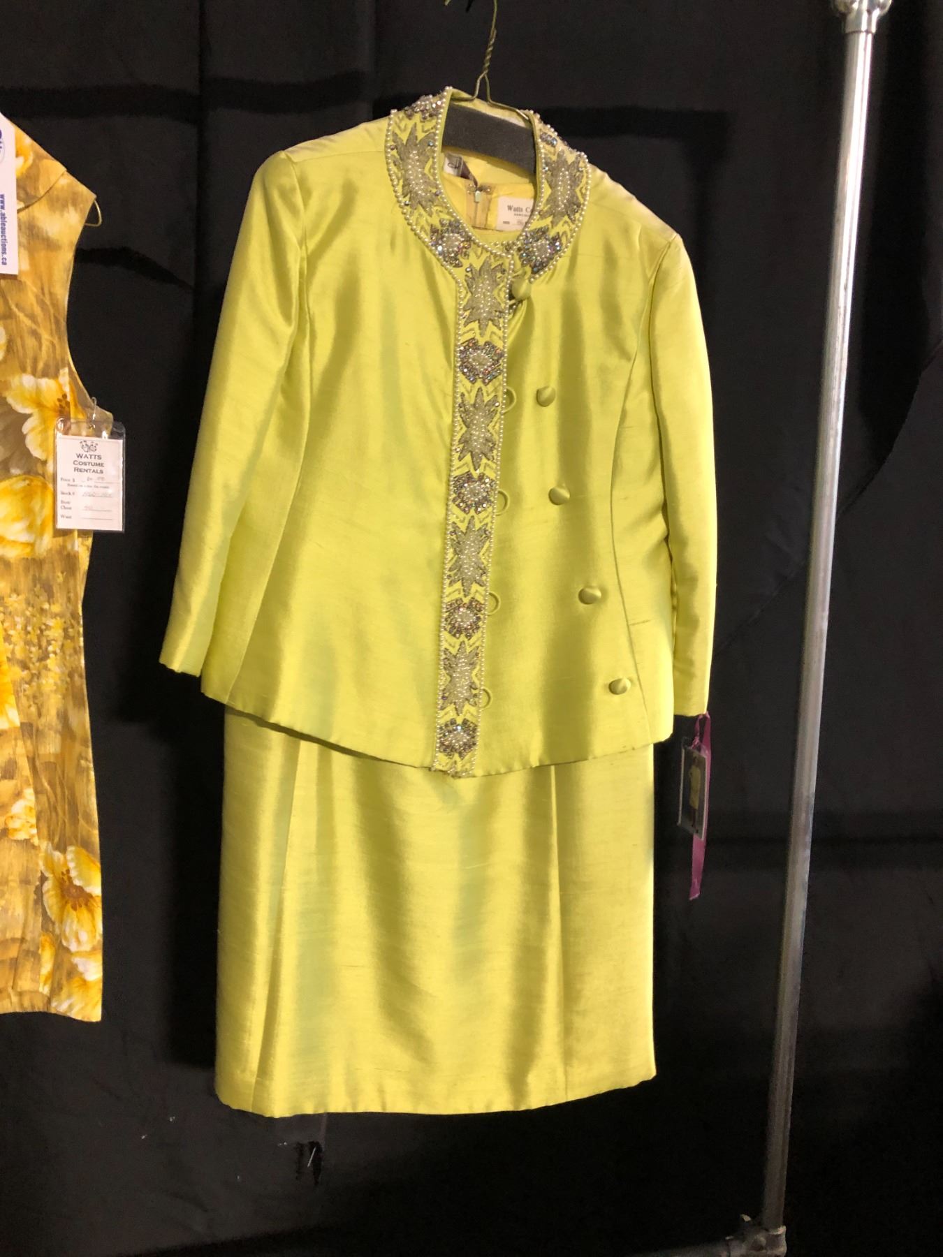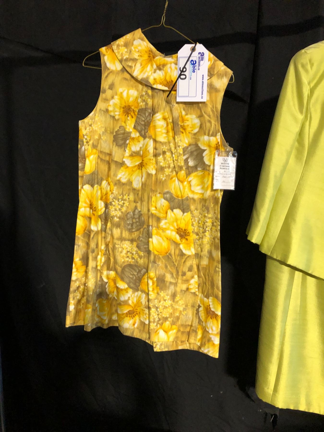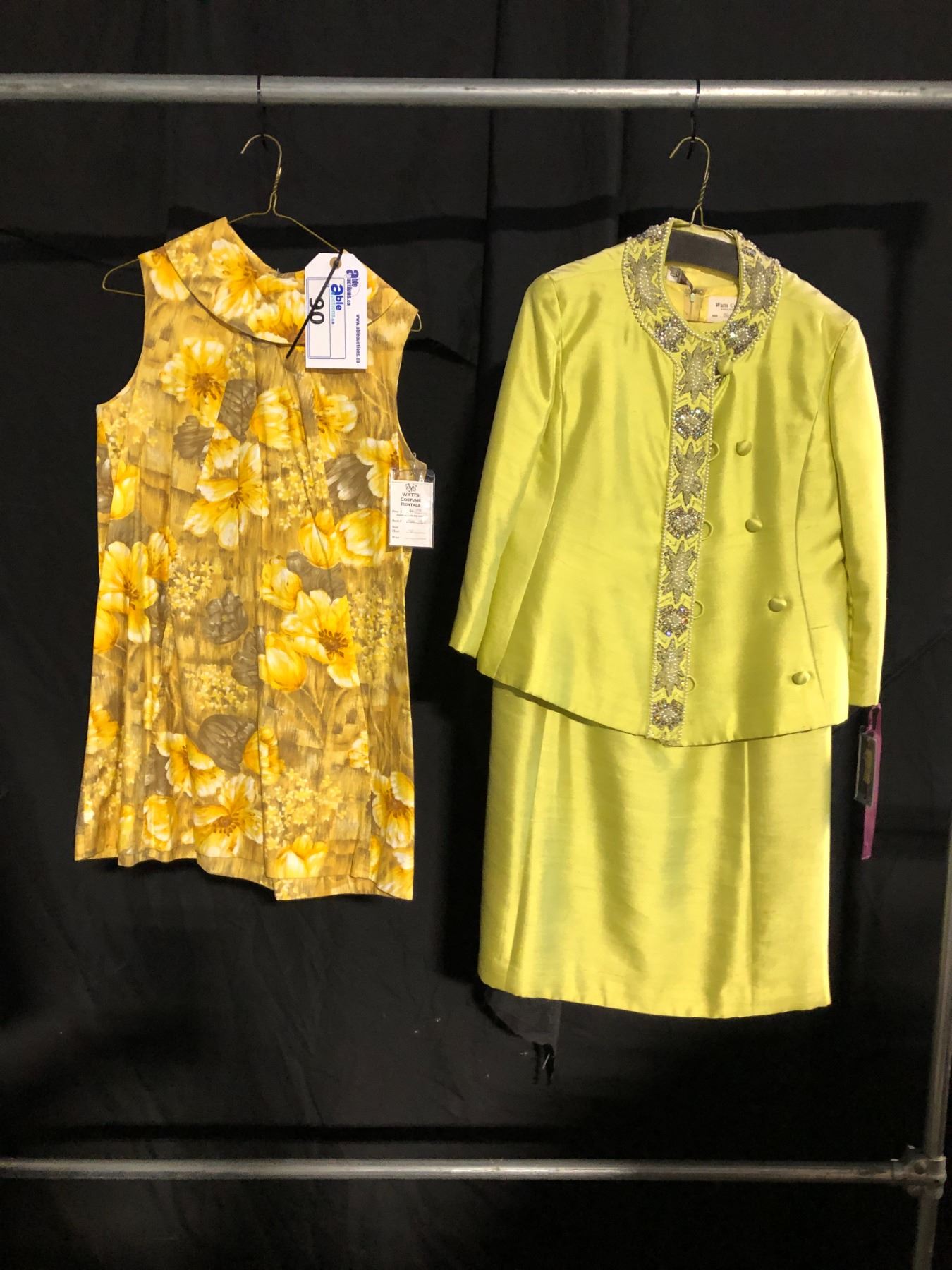 1960'S YELLOW FLORAL PRINT DRESS & 2 PIECE EVENING SUIT SKIRT SET, DAILY RENTAL $75.00
