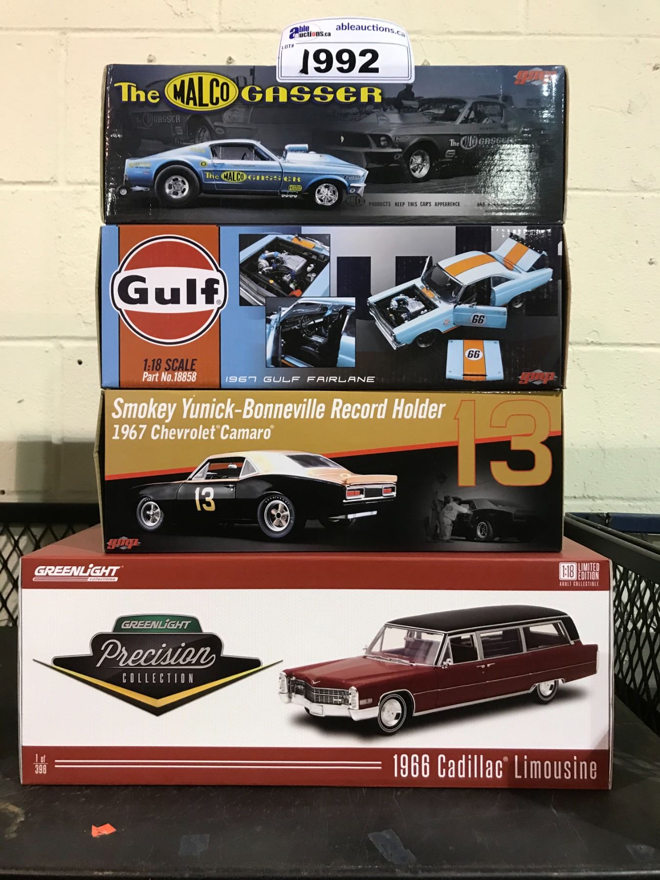 1967 MALCO MUSTANG GASSER WITH AIR PLOW, 1967 GULF FAIRLANE, 1967 CHEVROLET CAMARO (SMOKEY YUNICK-BONNEVILLE RECORD HOLDER) & GREENLIGHT 1966 CADILLAC LIMOUSINE MODELS