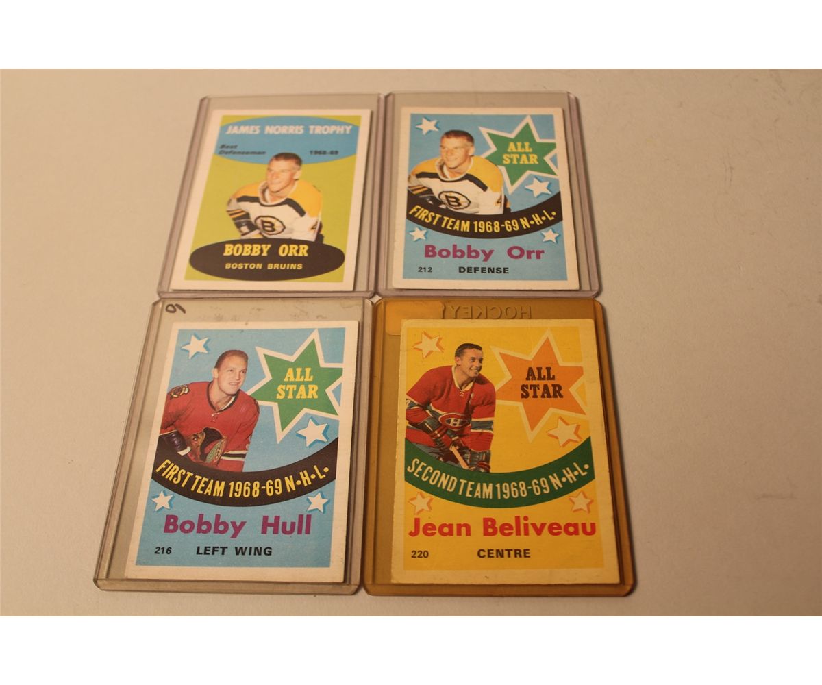 1968-69 TOPPS #209 BOBBY ORR JAMES NORRIS TROPHY, #212 BOBBY ORR, #216 BOBBY HULL AND #220 JEAN BELIVEAU
