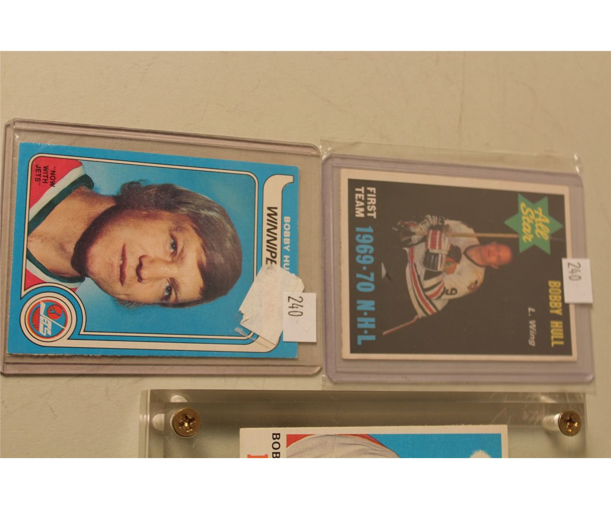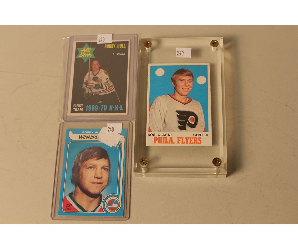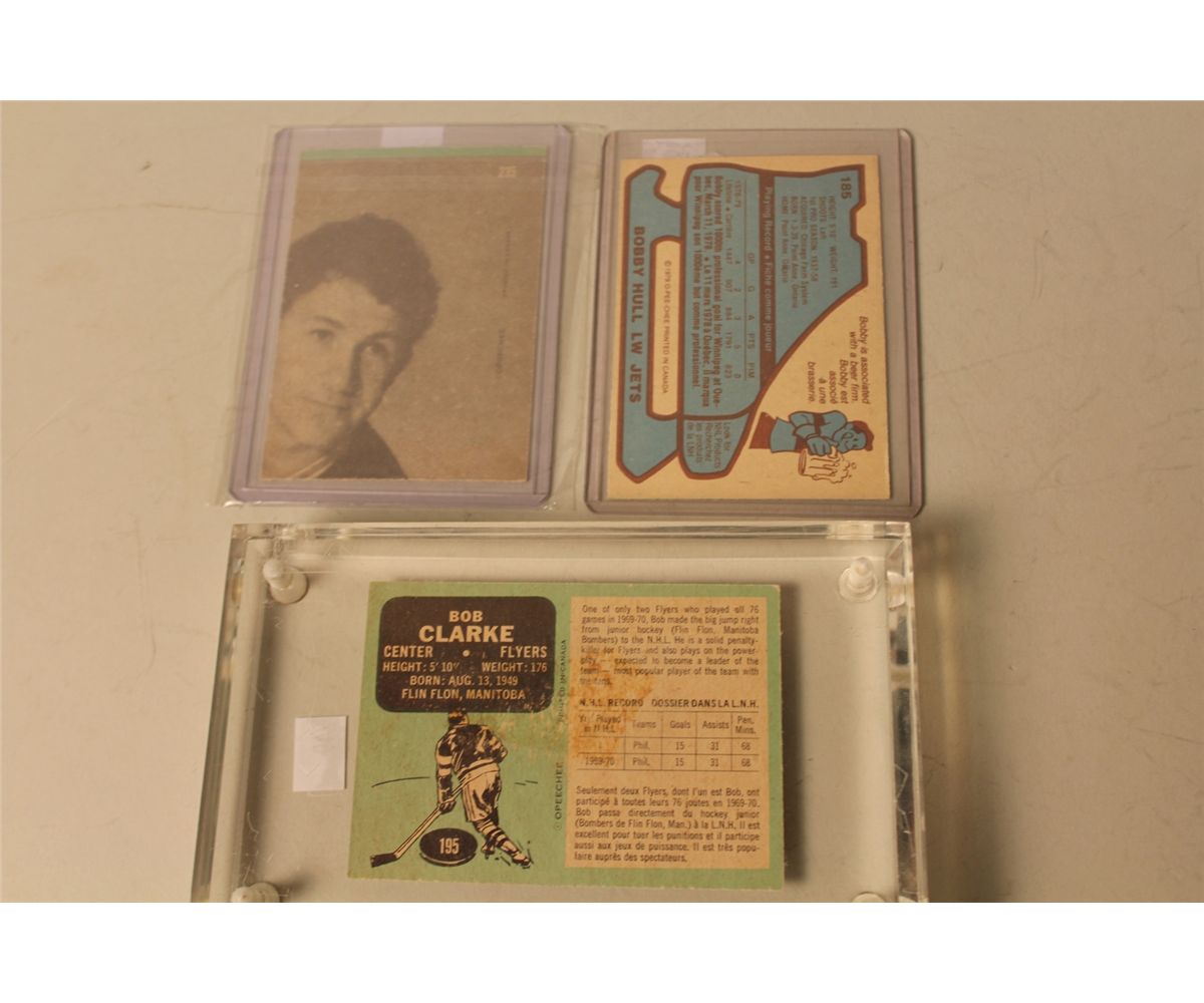 1970-71 OPC #195 BOB CLARKE ROOKIE CARD, 1970-71 OPC #235 BOBBY HULL AND 1979-80 OPC BOBBY HULL #185