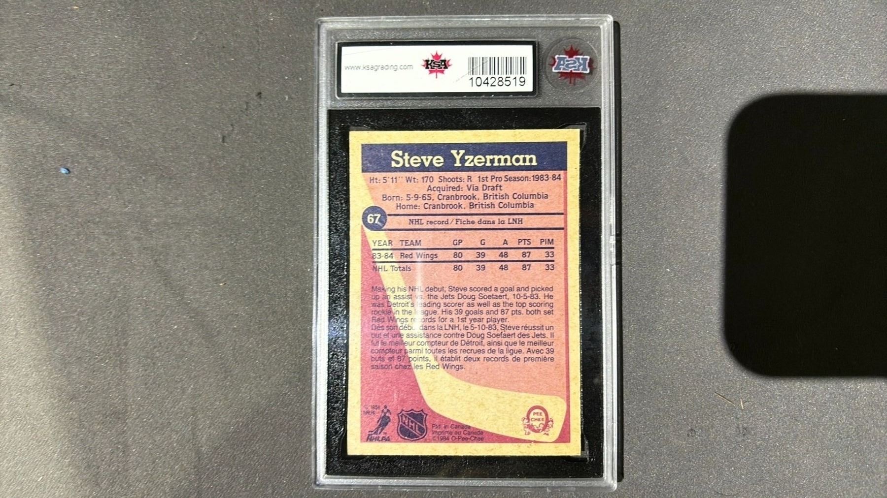 1984-1985 O-PEE-CHEE STEVE YZERMAN ROOKIE #67, KSA GRADED 6.5ENM+