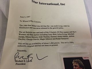 1984 STAR MILLER LITE ALL-STAR SET NEVER RELEASED TO THE GENERAL PUBLIC FEATURES: BIRD, IRVING, JORDAN, MALONE, THOMAS, ABDUL-JABBAR, DANTLEY, GERVIN, MAGIC JOHNSON AND SAMPSON.  CONTAINED IN FACTORY SEALED PACKAGE, NEVER OPENED