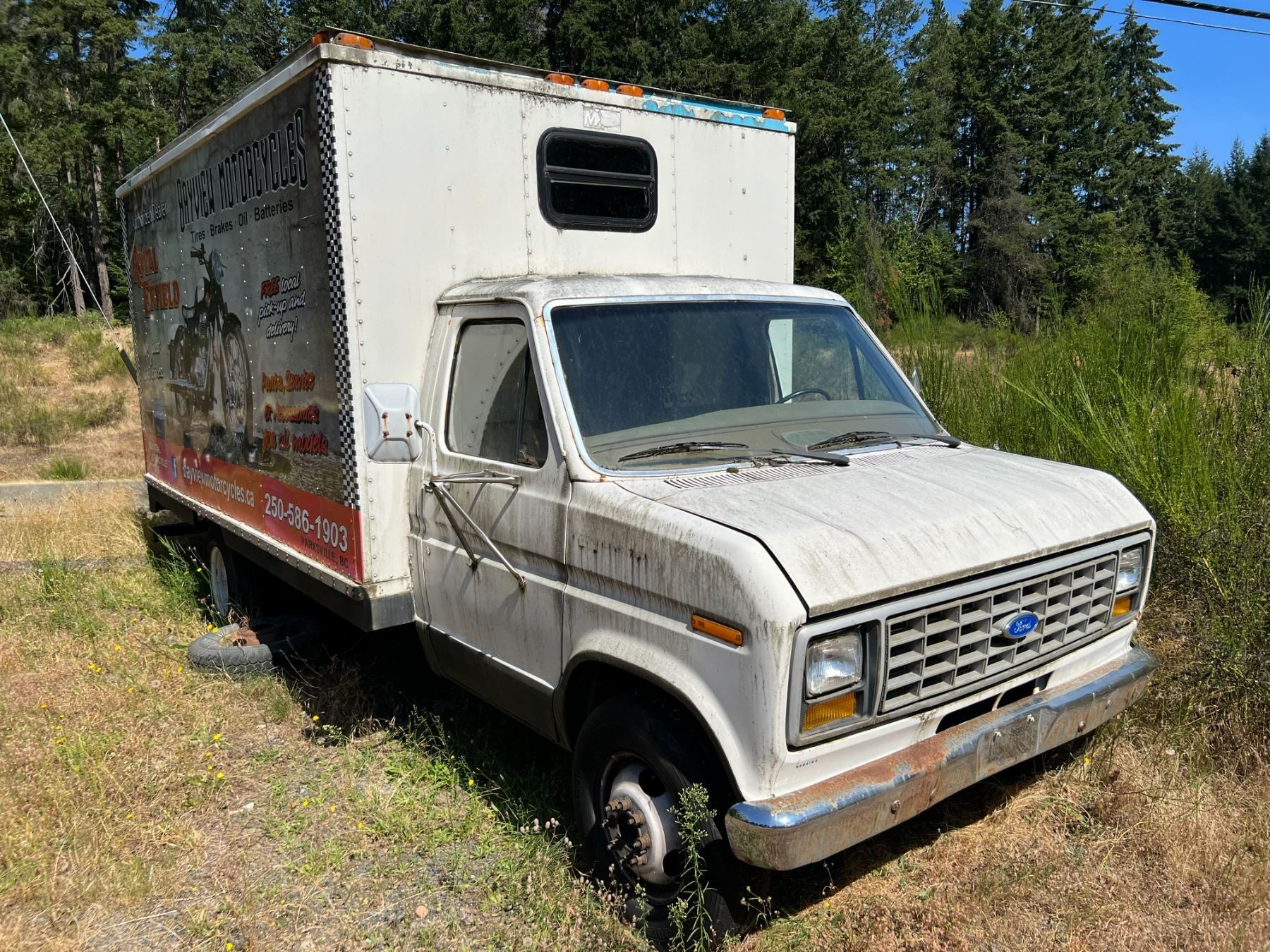 1986 FORD E350, 2DR CUBE VAN 6.9, WHITE, VIN # 1FDKE3015GHB07878 208,032KMS, DIESEL, AUTO ICBC REPAIRED DECS TTL $6,966.98 RUST ON FRONT BUMPER, NO ANTENNA, BEEN SITTING FOR A WHILE, RUSTED FLOOR BOARD, NO RADIO, DRIVER SIDE MIRROR OFF