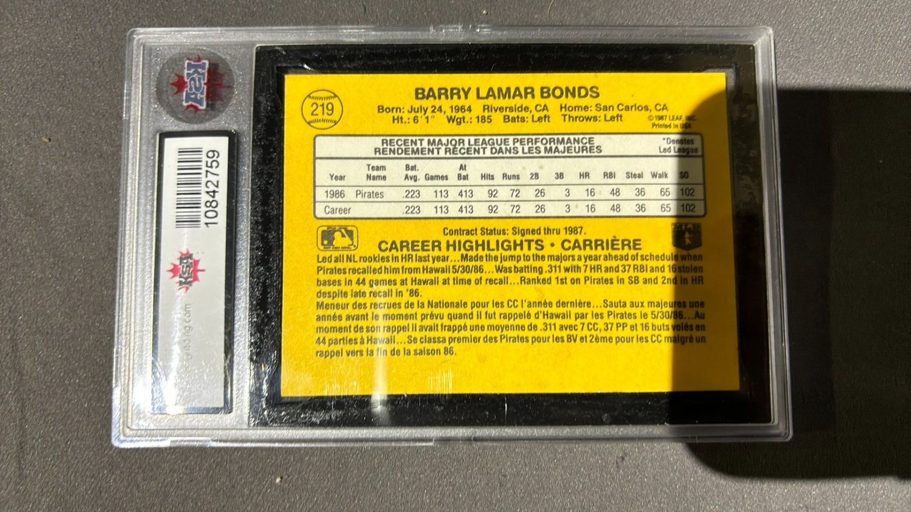 1987 LEAF BARRY BONDS ROOKIE 219, KSA GRADED - 6.5 ENM+
