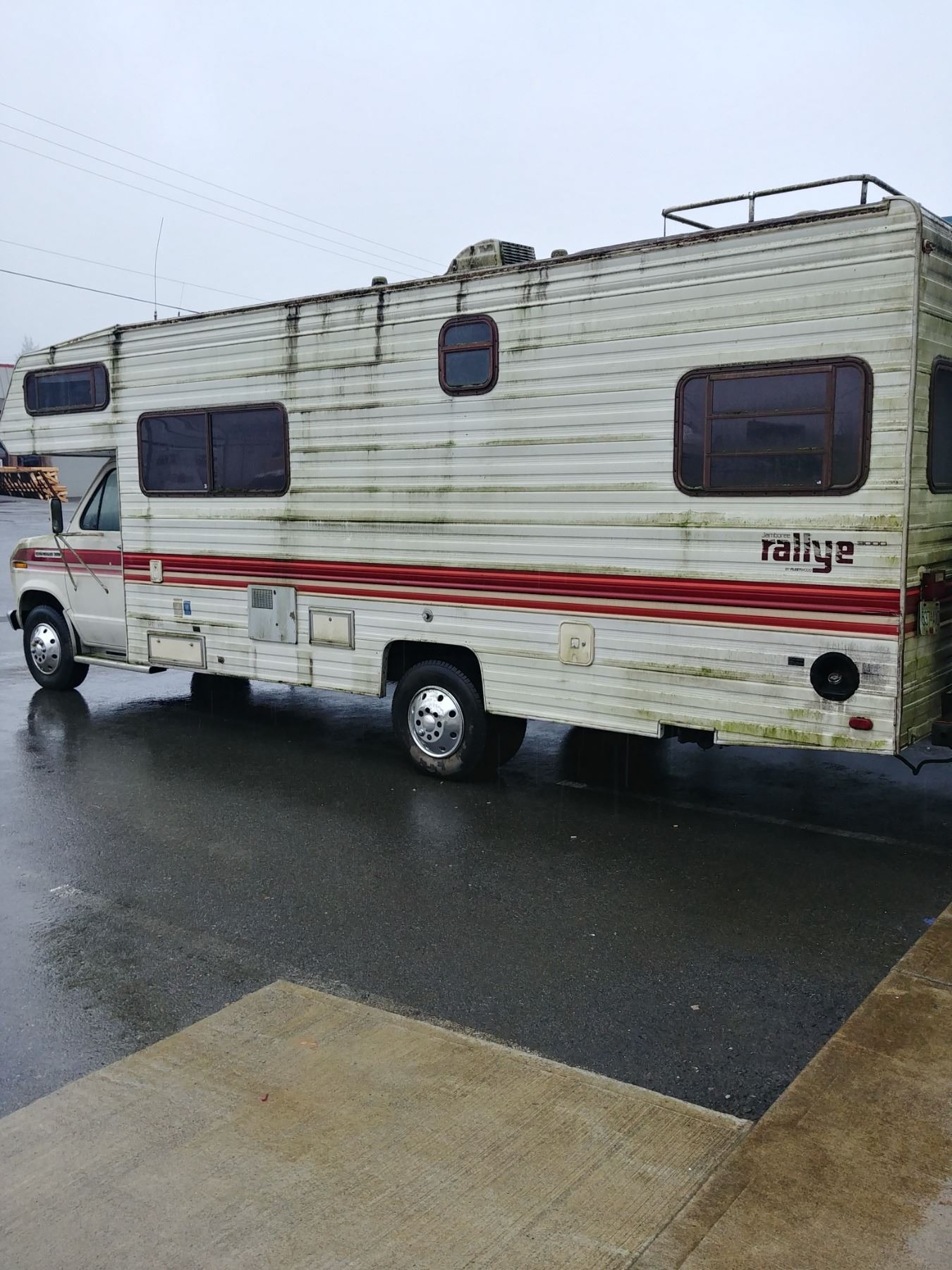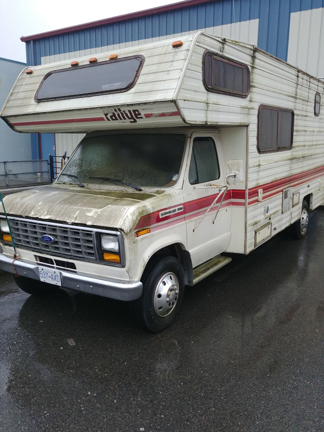 1988 JAMBOREE MOTORHOME, 26', FORD CHASIS, VIN # 1FDKE30G5JHA04648, STARTS WITH A BOOST, DIRTY, HAS HAD MICE, NO DECS