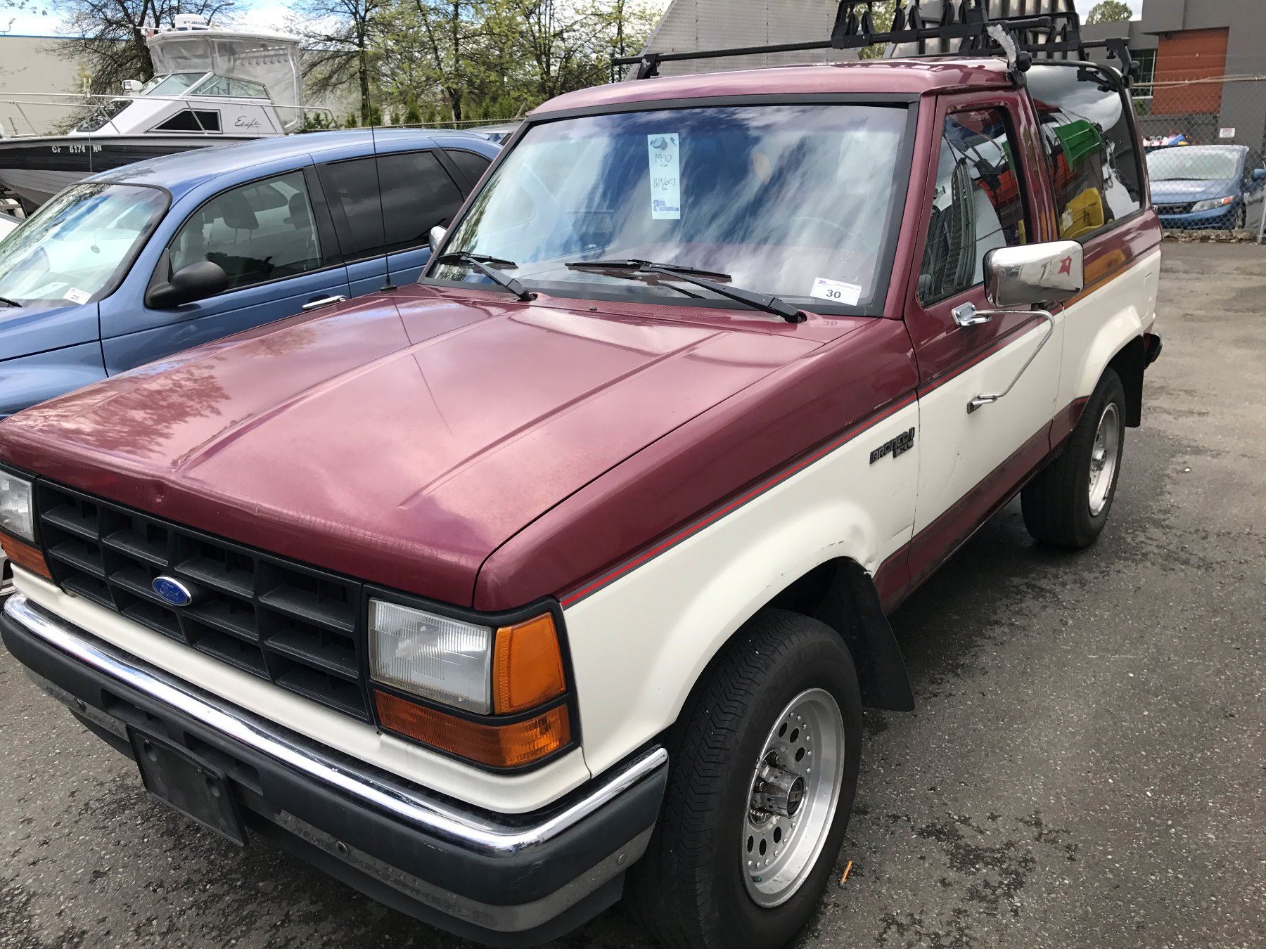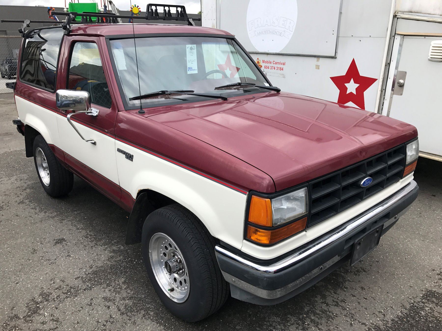1990 FORD BRONCO II XL, 2 DOOR SUV, RED/WHITE, VIN # 1FMCU14TXLUA93193 169,607KMS, GAS, AUTOMATIC RD, 4W, AC, CR, ICBC NO DETAILS