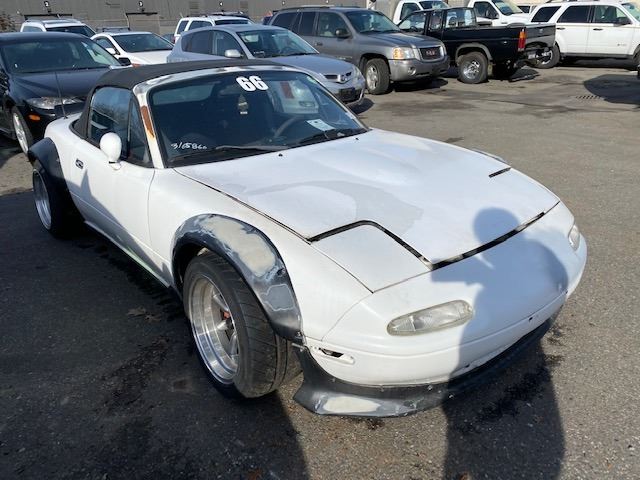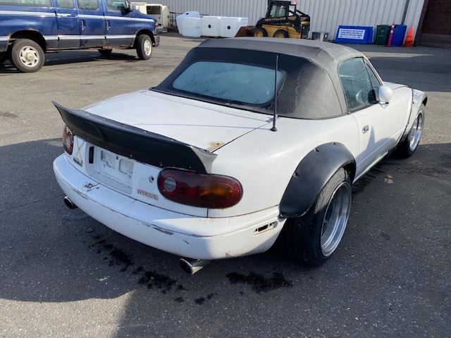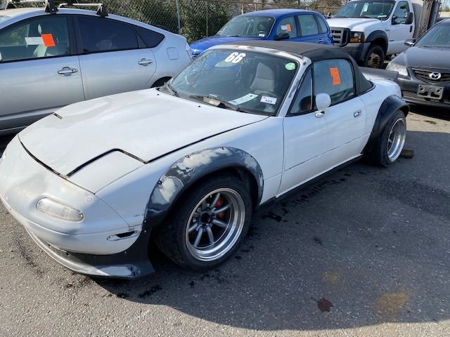 1990 MAZDA MX5 MIATA, 2DR CONVERTIBLE, WHITE, VIN # JM1NA3526L0128438 311,269KMS, GAS, MANUAL RD,CD,AW, HAS BODY KITS ON, PAINT PEELING, MOLDY 2 DIFFERENT SEATS, OOP, ICBC REPAIRED DECS TTL $6,042.70 *NO KEYS, MUST TOW, NOT ROADWORTHY* *HAS BC REGISTRATION*