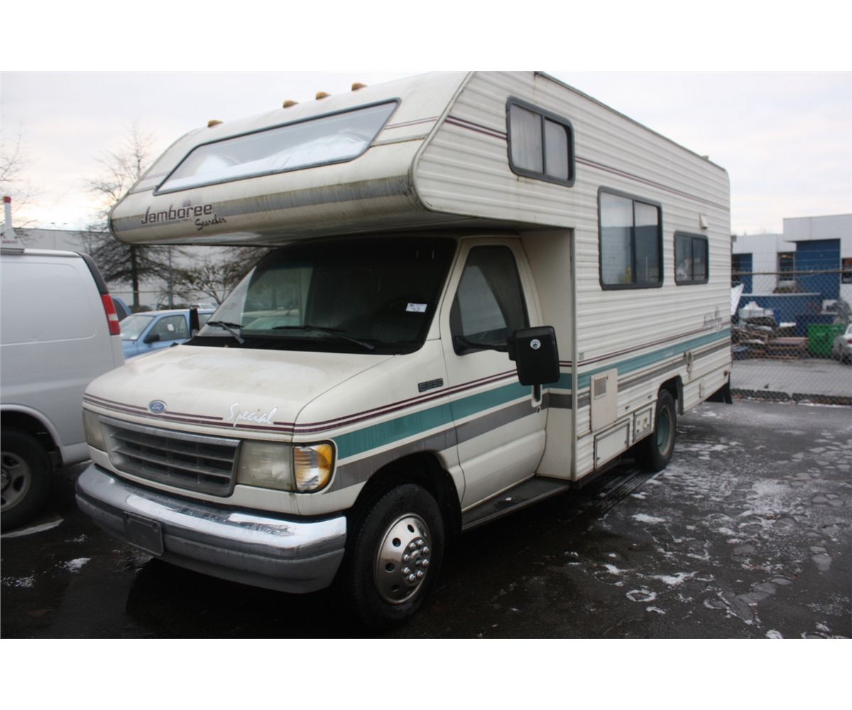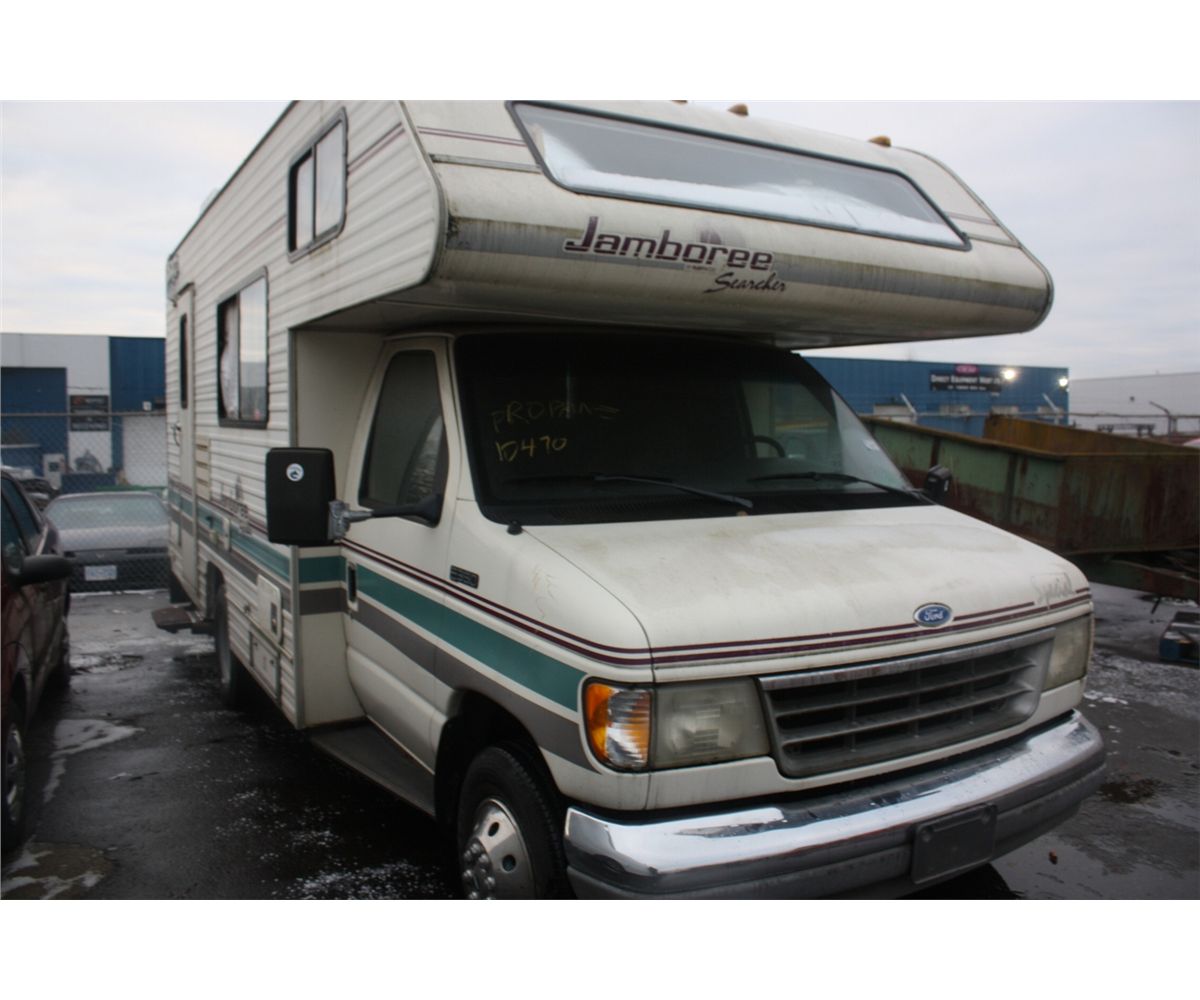 1992 WHITE FORD E-350 JAMBOREE MOTORHOME 65,534MILES GAS 7.5L AUTOMATIC VIN:1FDKE30G9NHB63761 - BROKEN CAMPER WINDOW - ROOF LEAKING - IMPORTED FROM OUTSIDE OF CANADA - RD CC TW AC CR  - AIRCARE REQUIRED