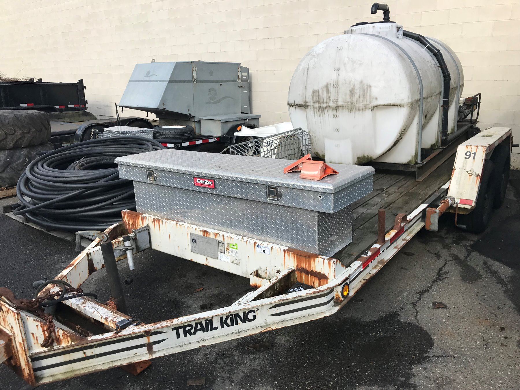 1993 TRAIL KING 16'X6' FLATDECK TRAILER, WHITE, VIN#1TKU01627PM023108, NO ICBC DECLARATIONS, COMES WITH LIQUID STORAGE TANK, 2 GAS PUMPS, HOSE, TOOL BOXES, GVWR 12,280LBS