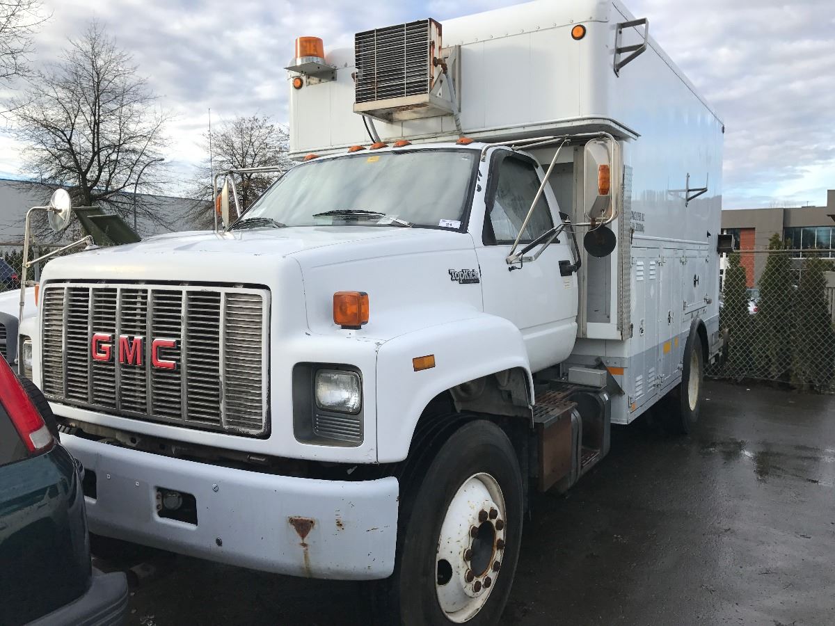 1994 GMC TOPKICK FUEL INJECTION, VAN, WHITE, VIN # 1GDJ7H1M7RJ504810 128,242KMS, GAS, MANUAL RD, GVW 20,000KG, WORK TRUCK WITH WORK BENCH, NO ICBC DECLARATIONS BUILT IN HONDA GENERATOR AND PTO COMPRESSOR