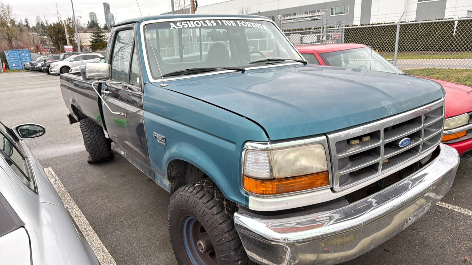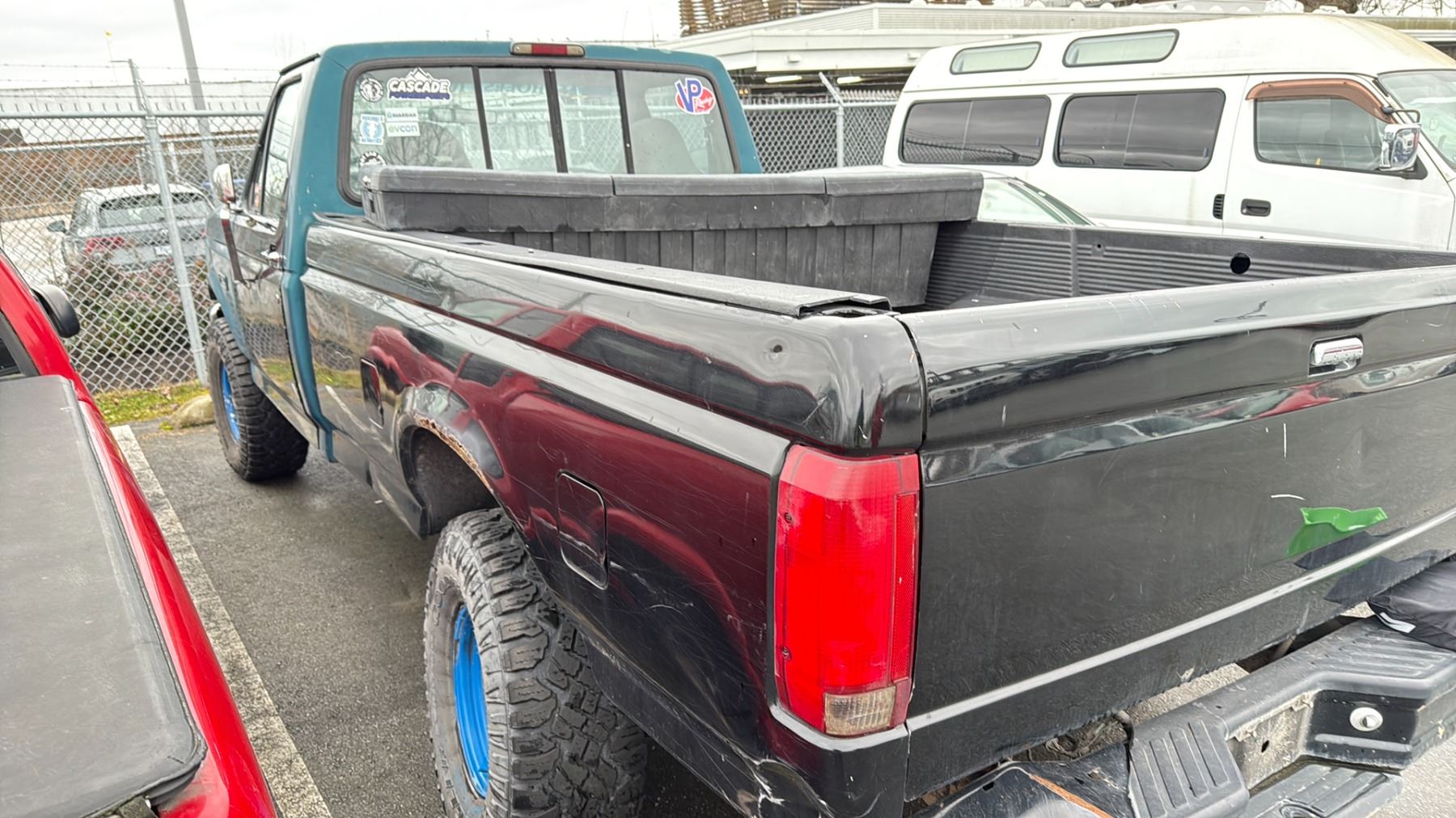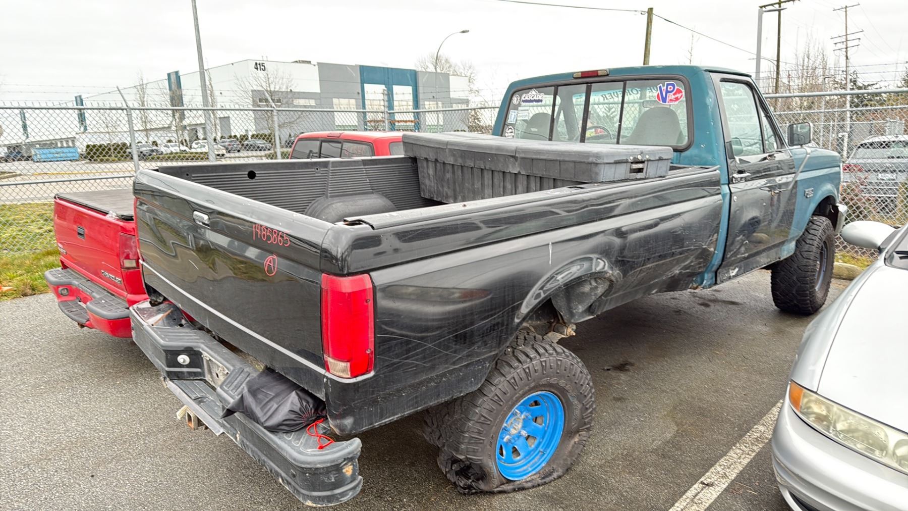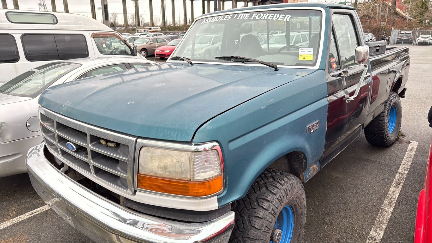 1996 FORD F-150 XL, 2DR PU, BLACK & GREEN, VIN 2FTEF14NXTCA18731 TMU, GAS (G), 4.5L, MANUAL, HAS REGISTRATION, NO KEYS, FEATURES: RADIO, COMPACT DISC, TRAILER HITCH, *MUST TOW, NO KEYS, NOT SUITABLE FOR TRANSPORTATION*, FLAT TIRES, RUST ISSUES, TOOL BOX, SCRATCHES ALL OVER, 4X4, 2 X NO DETAILS 1 X REPAIRED $614.15
