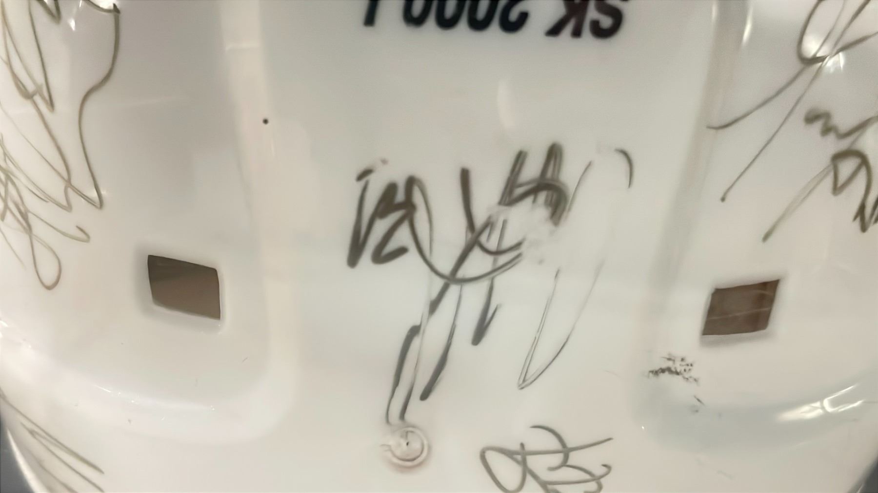 1996 VANCOUVER CANUCKS TEAM SIGNED COOPER HOCKEY HELMET IN DISPLAY CASE (HELMET ADJUSTMENT CLIPS BROKEN, NO AUTHENTICATION)