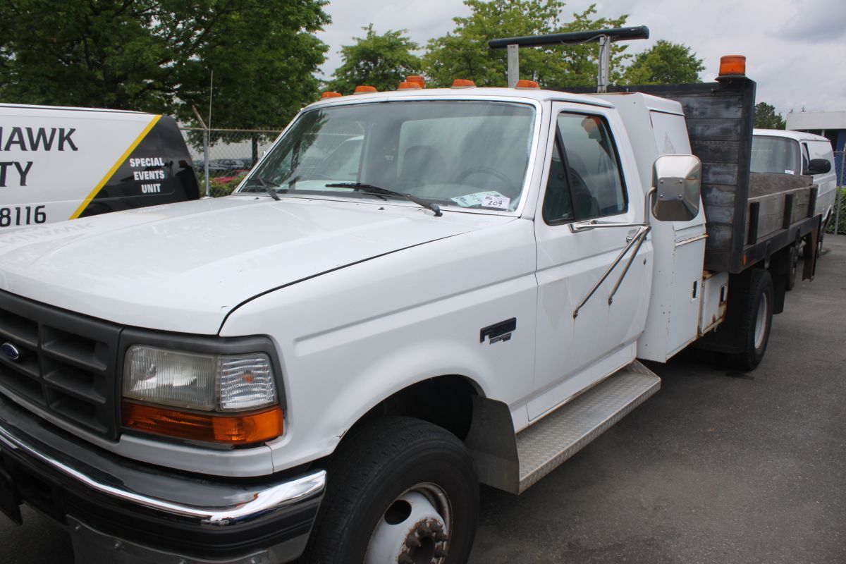1996 WHITE FORD F-SUPER DUTY POWER STROKE FLAT DECK 87,961KM 7.3L DIESEL AUTOMATIC VIN:1FDLF47F0TEB35477 10' DECK - POWER LIFT GATE - RD CR -AIRCARE REQUIRED
