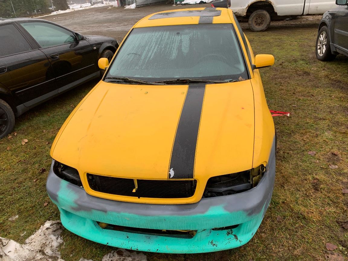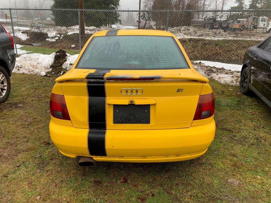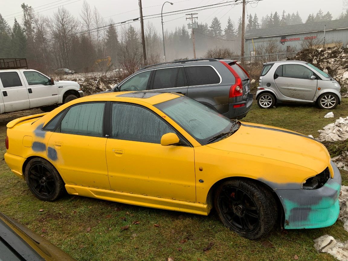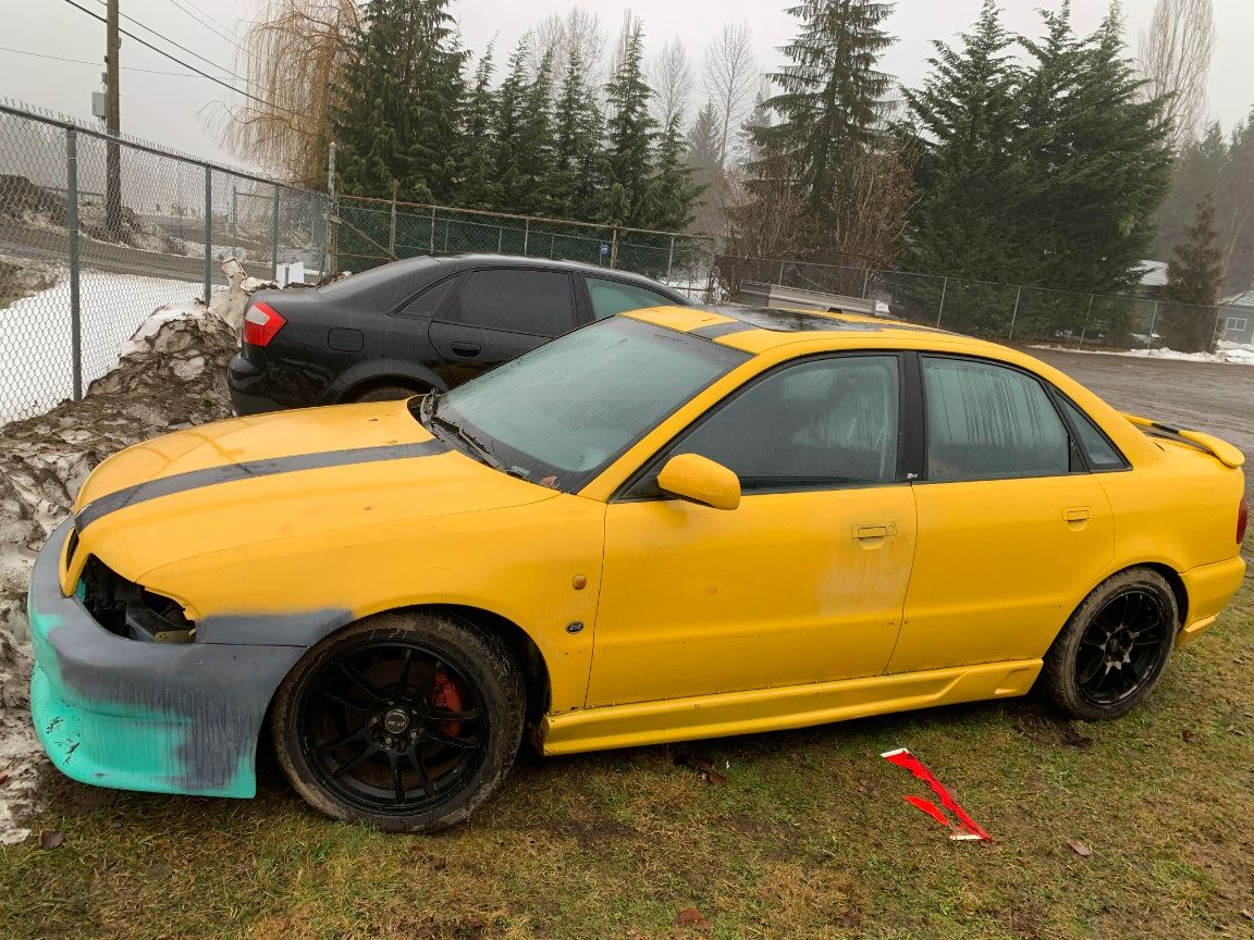 1997 AUDI A4 - MODEL RS -YELLOW - VIN WAUCB88D3VA039936 5-DOOR SEDAN - APPROX 179,837 MILES RD/PW/CC/AW/PL/TW/AC/SR/CR/HS - NEW TURBO CHARGER, PROJECT CAR AFTER MARKET TRIM ADDED ON SIDES - WATER ON FLOOR DASH AIR BAG PUMP, PRIMER PAINT MULTIPLE LOCATIONS DENT REAR DRIVER SIDE, ASSTD PARTS IN TRUNK, TRIM MISSING BOTH SIDES, LIGHTS NOT INSTALLED NO LIENS, $3922 ICBC DECLARATIONS, OOC, REGISTERED IN BC AS SALVAGE MUST BE TOWED