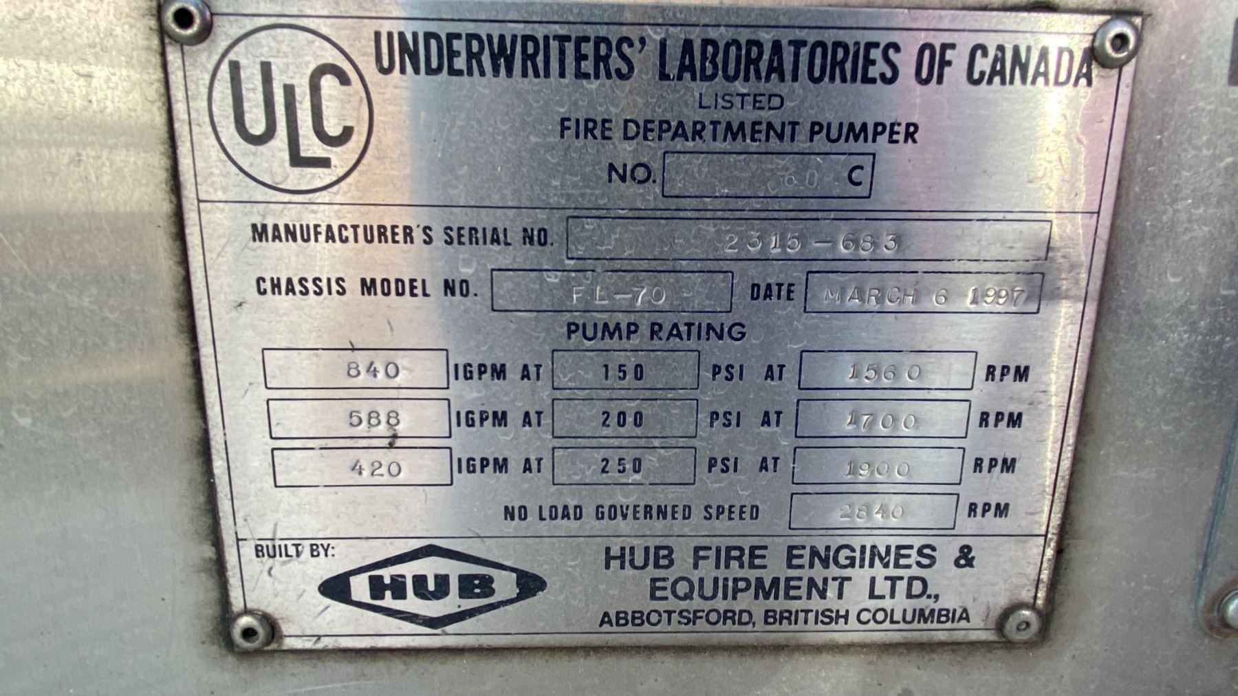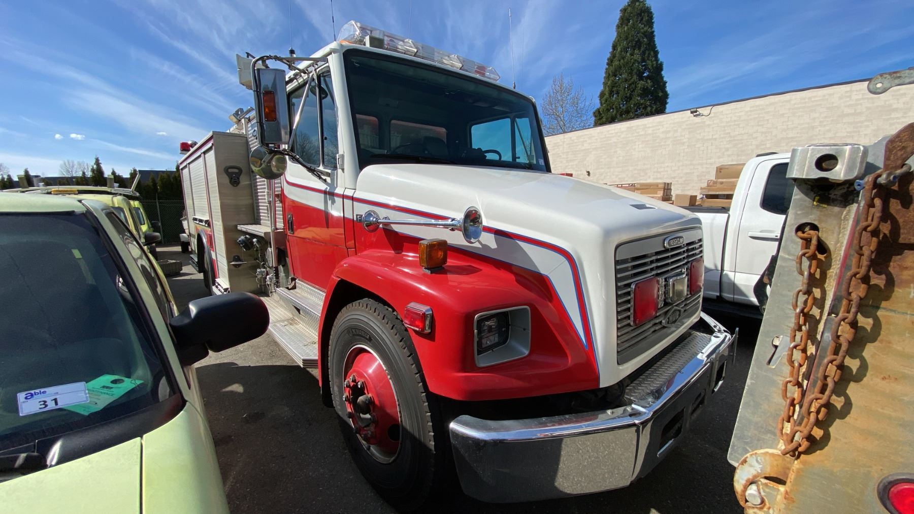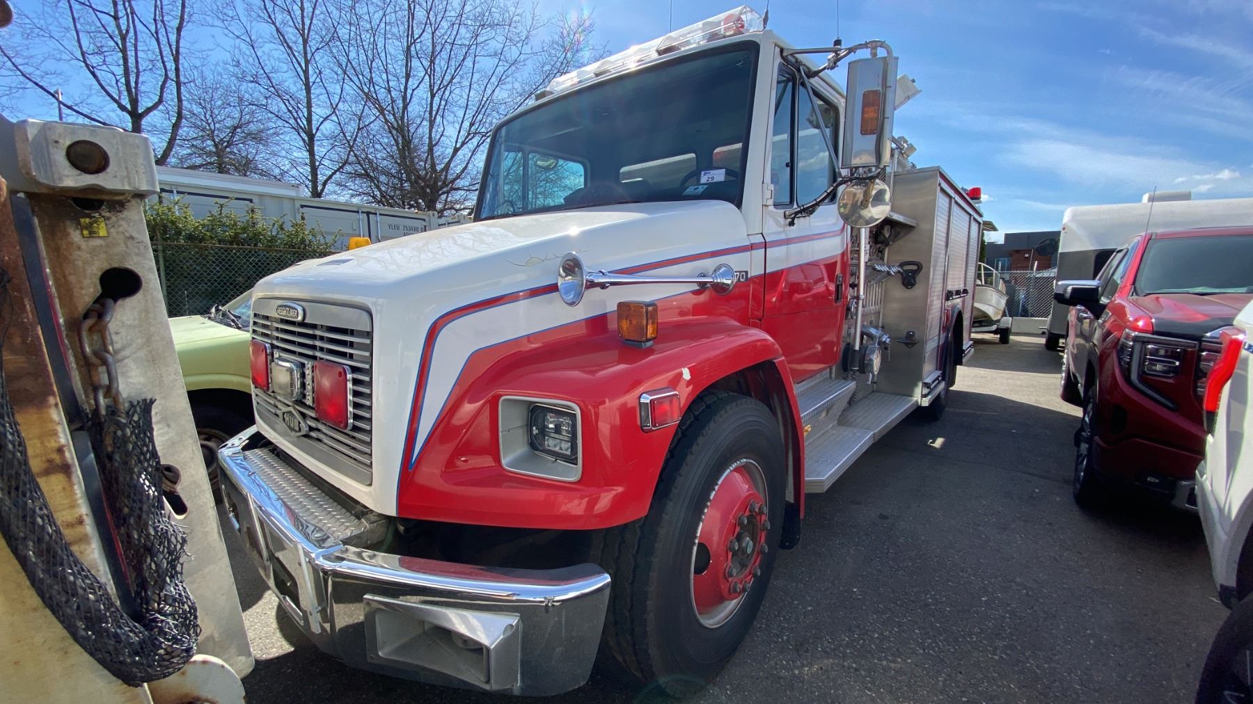 1997 FREIGHTLINER FL70, 2DR PUMPER, WHITE, VIN 1FV6HLCA8VH784322, 425,507 KMS, DIESEL (D), AUTOMATIC, HAS REGISTRATION, HAS KEYS, FEATURES: RADIO, TILT WHEEL, HISTORY: X-EMERGENCY,1 ICBC REAPIRED DECLARATION $32,185.18, 2 SEAT FIRE RESCUE, SINGLE AXLE, HALE DSD100-23L PUMPING STATION, SIDE ROLL UP SERVICE BOXES, HUB BOXES, LIGHTS, KILL SWITCH UNDER DRIVER SEAT, AIR BRAKES, U-COM CODE 3 HORN RADIO, ABS LIGHT ON