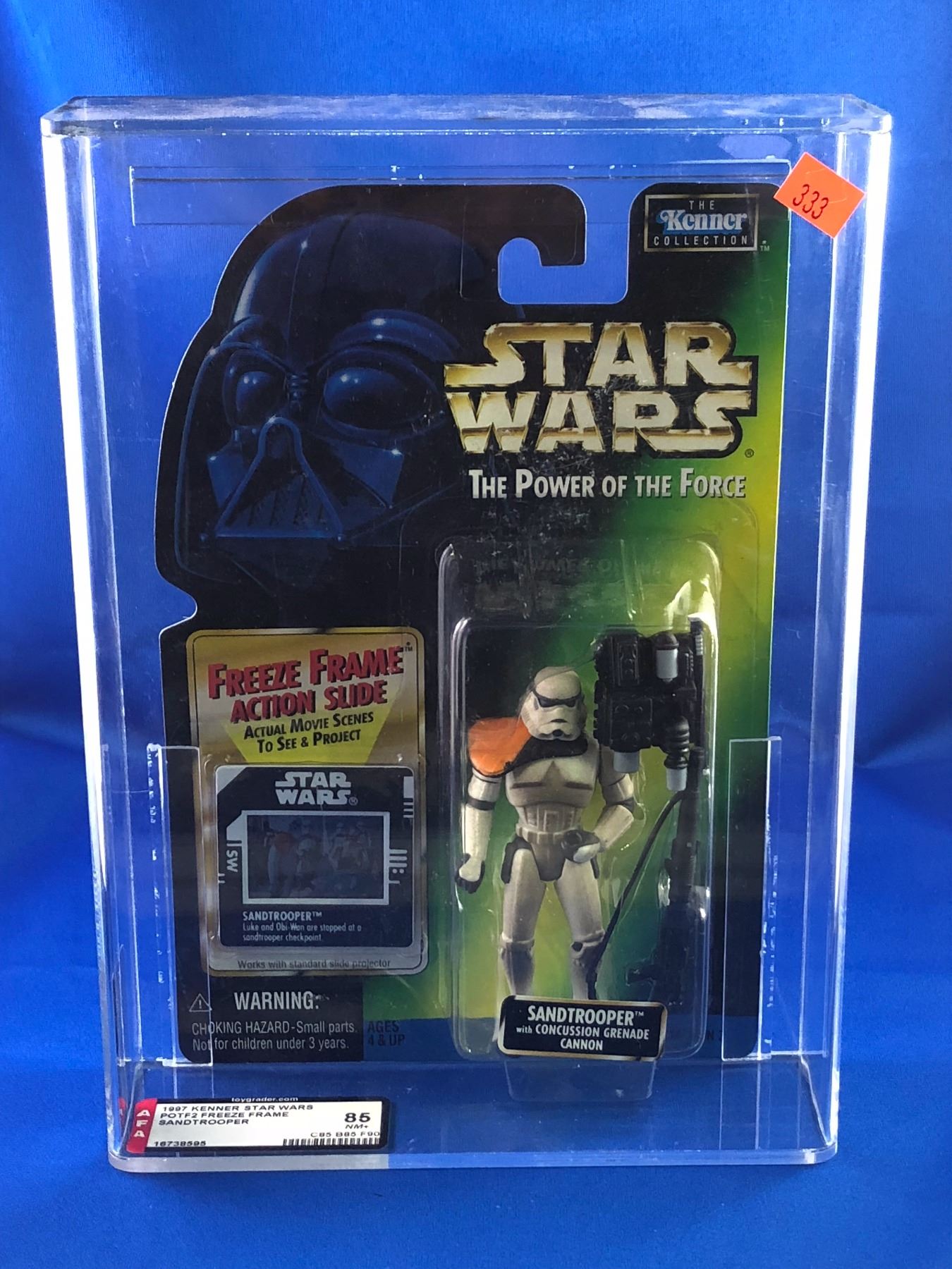 1997 KENNER STAR WARS THE POWER OF THE FORCE 2 FREEZE FRAME SANDTROOPER FIGURE IN ORIGINAL PACKAGE AFA GRADED 85 NM+