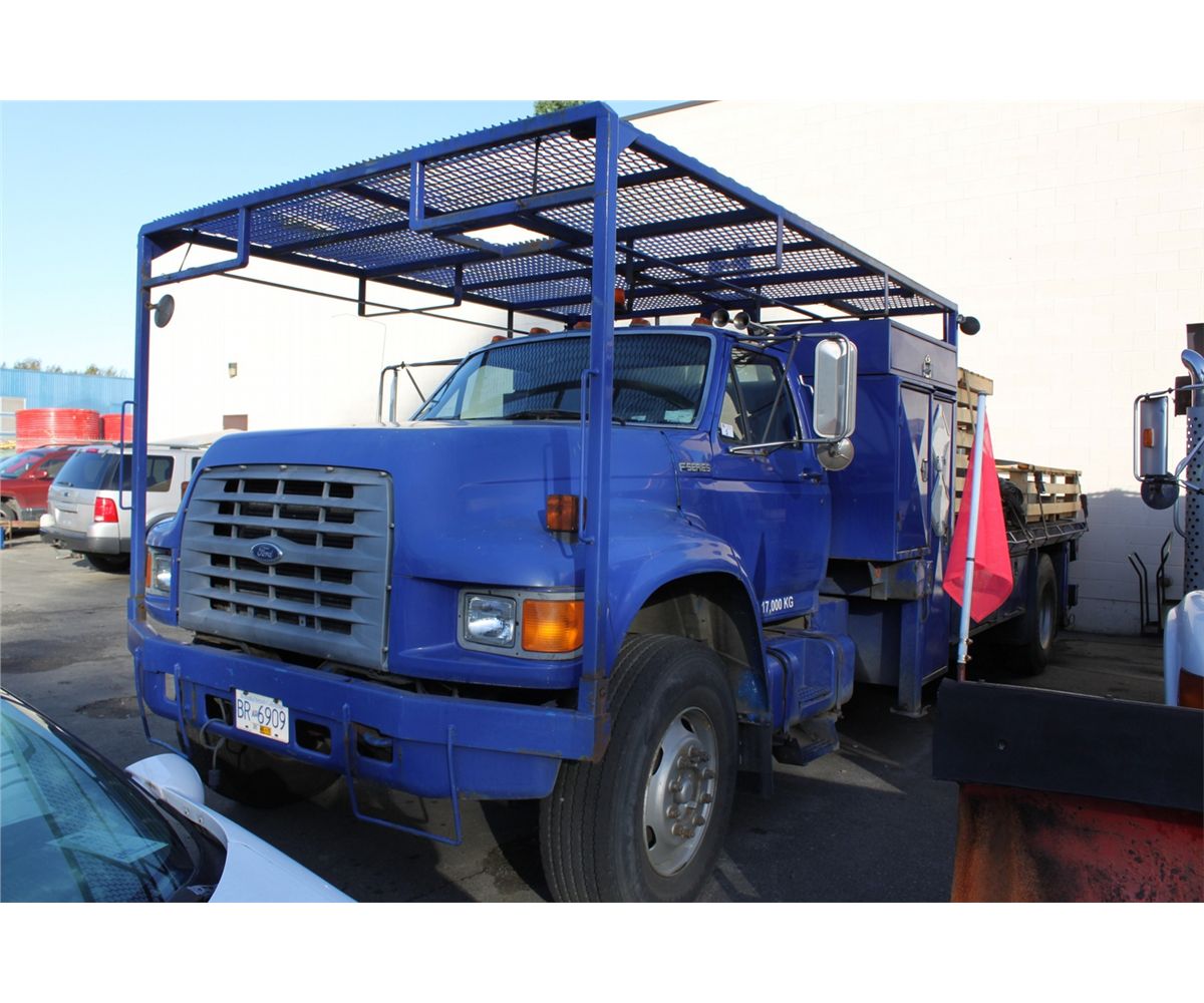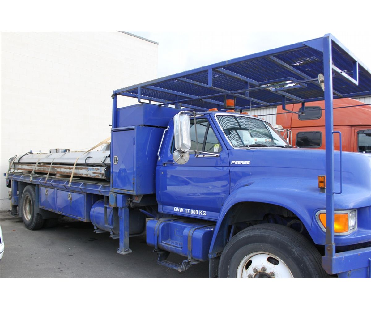 1998 BLUE FORD F800 FLAT DECK 246,301KM DIESEL MANUAL VIN:1FD4F80C7WVA22904 - 2NDC - 2 GLASS REPAIRS TTL$952.74 - 1 COMP. $ 9,900.00 - BOOM ATTACHMENT - RD CR - AIRCARE REQUIRED