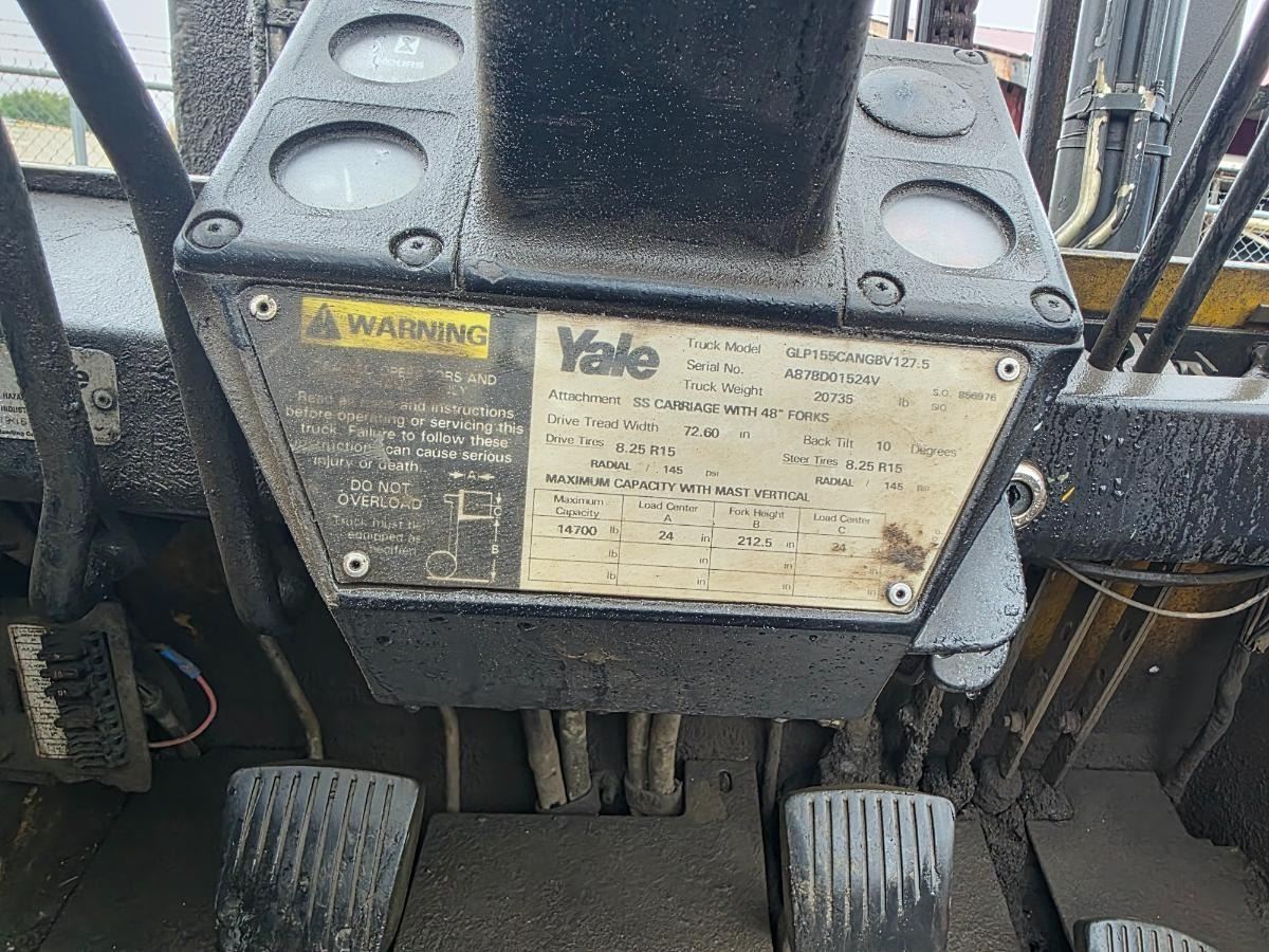 1998 YALE GLP155C FORKLIFT, YELLOW, PROPANE, 15,000LB CAPACITY, 20' LIFT HEIGHT, 2,394 HOURS, *HOURS NOT VERIFIED*, PROPANE TANK INCLUDED, RUNNING CONDITION, 6’ FORKS, SHIPPING DIMENSIONS 12’2†HIGH, 85†WIDE, 18’9†LONG, NEEDS CLEANING, LOCATED IN KAMLOOPS