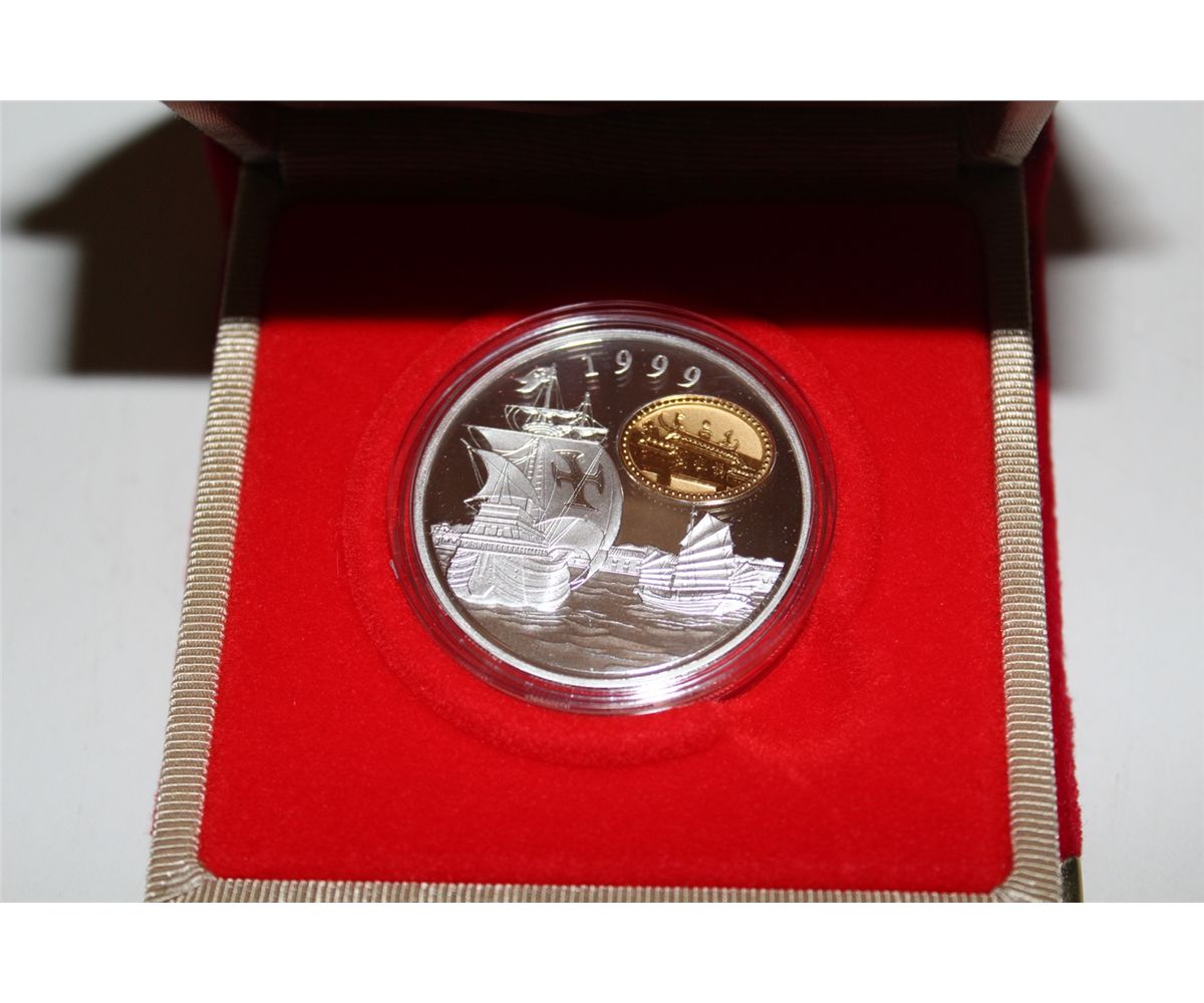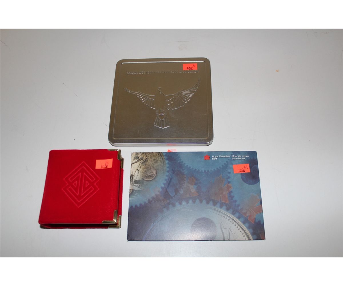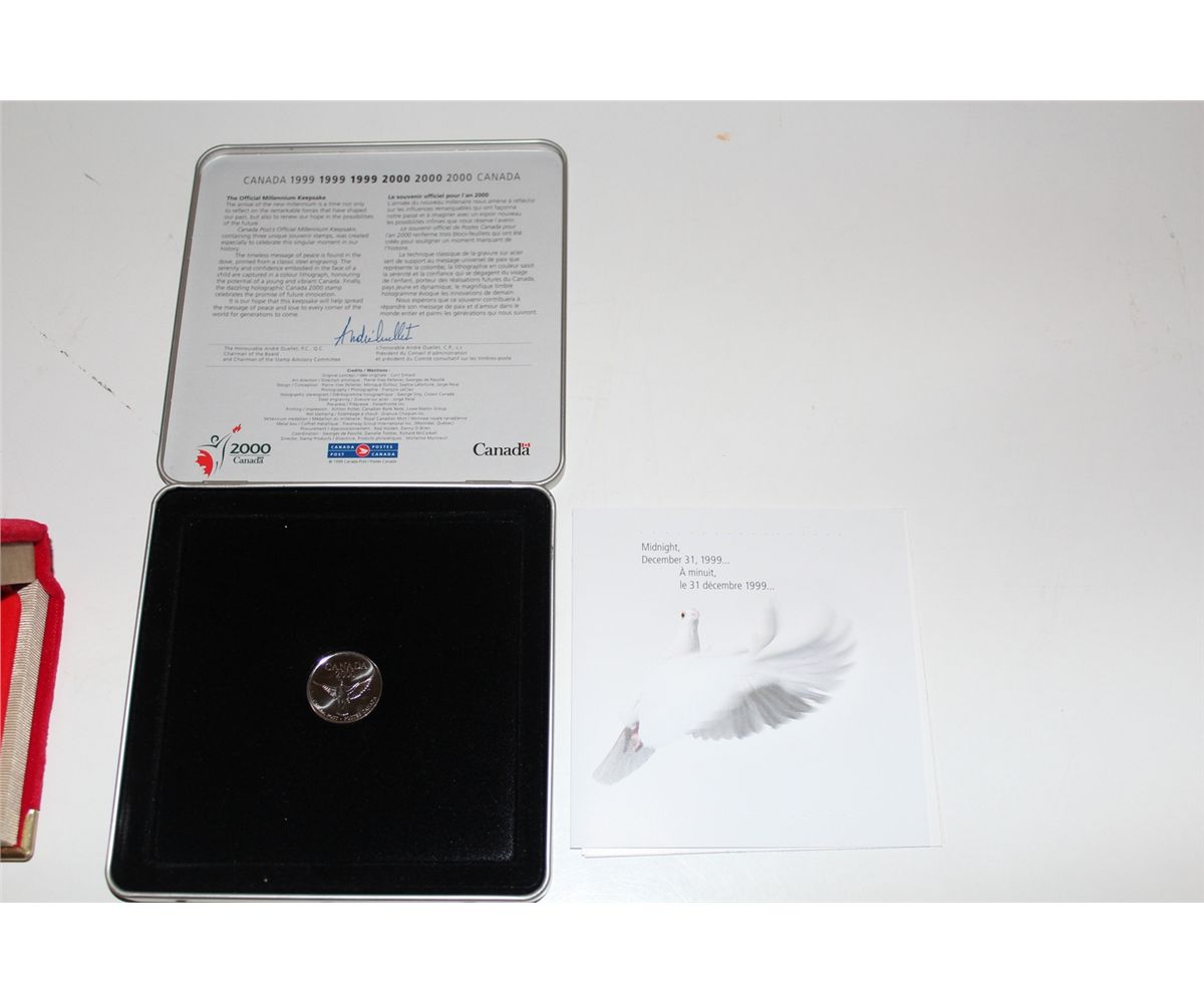 1999 CANADA MACAU PATACAS COMMEMORATIVE SILVER COIN IN ORIGINAL PACKAGING + 1999 PLATED TEST COIN SET AND THE OFFICIAL MILLENIUM KEEPSAKE COIN AND STAMPS