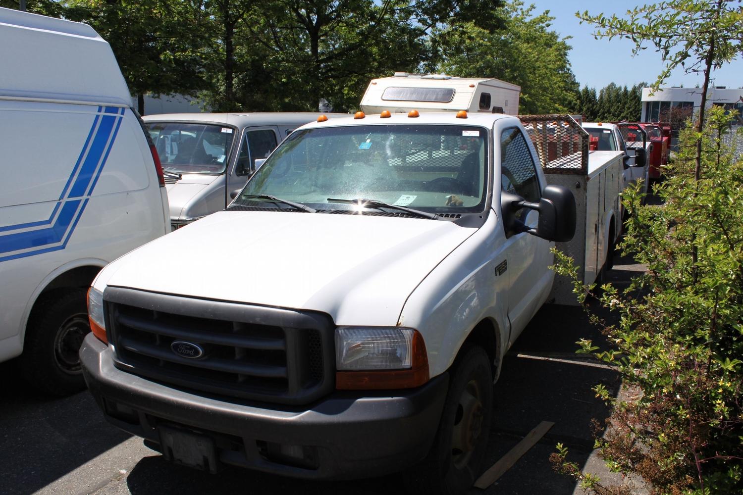 1999 WHITE FORD F-350 SUPERDUTY UTILITY TRUCK 333 - 533KM GAS 6.8L AUTOMATIC TRANS VIN: 1FDWF36X0XEB93715 15% OOP *DEAD BATT - DRIVERS DOOR DOESNT UNLOCK W KEY - POWER LIFT GATE - RUST / POOR PAINT - 1 X ICBC NO DETAILS* RD AC AIRCARE: REQ