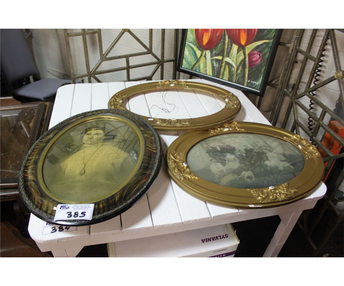 1SET OF 3 ANTIQUE FRAMED PICTURES - 2 GOLD GUILDED FRAMES & 1 MULTI COLOURED FRAME WITH CURVED FRONT