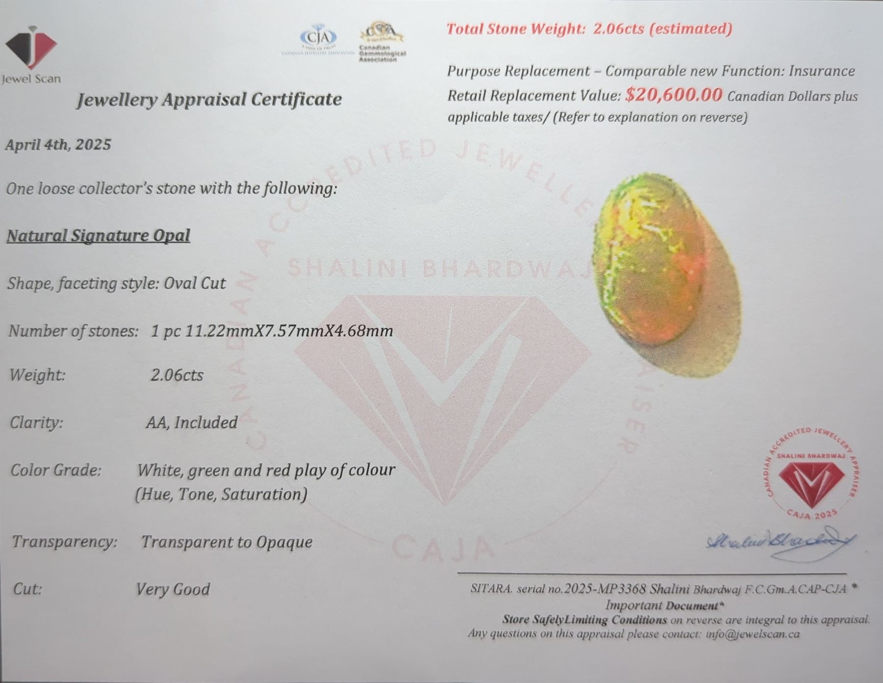 2.06 CT CERTIFIED OPAL GEMSTONE ($20,600 APPRAISAL) - **APPRAISAL NOT GUARANTEED**