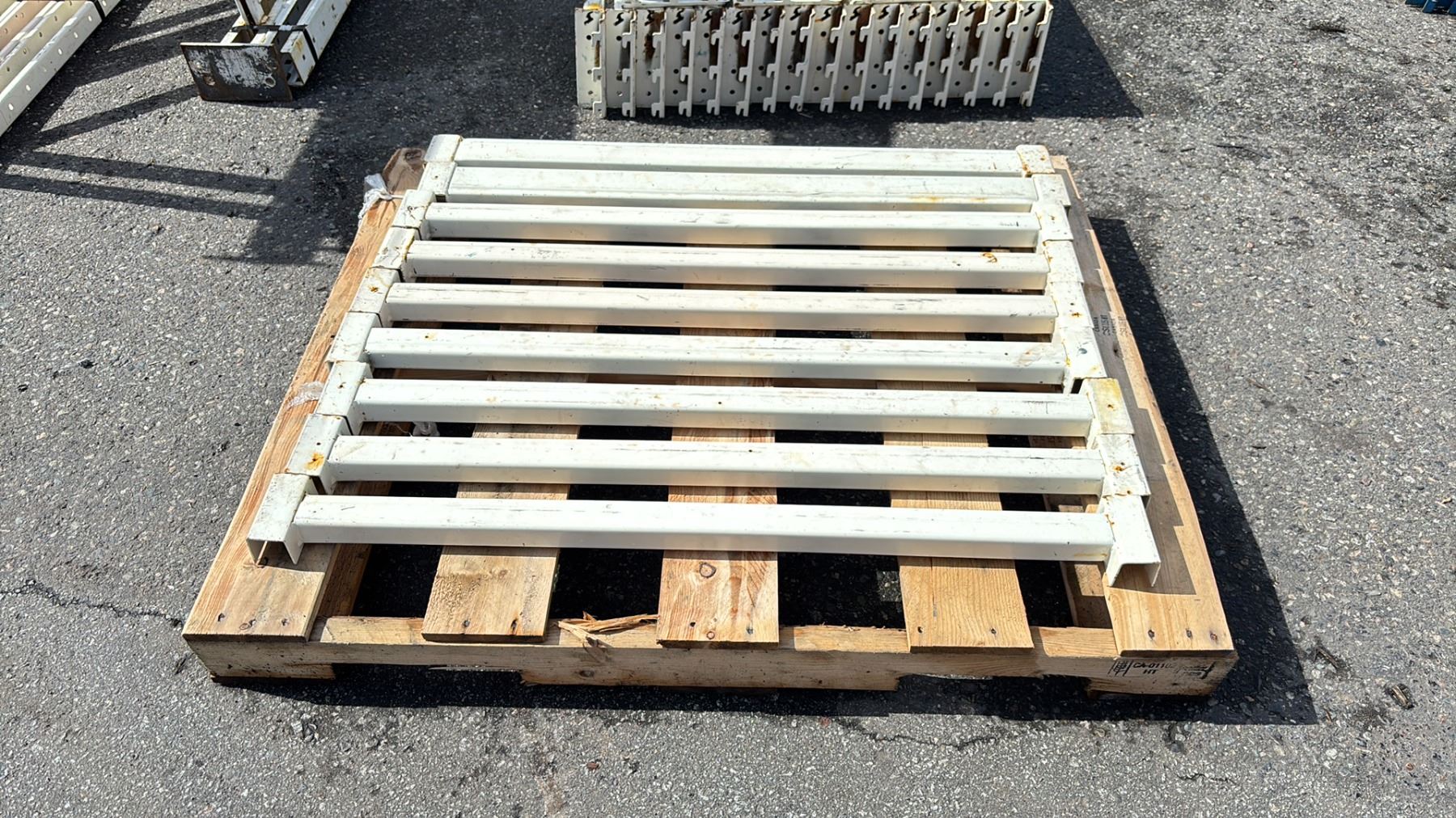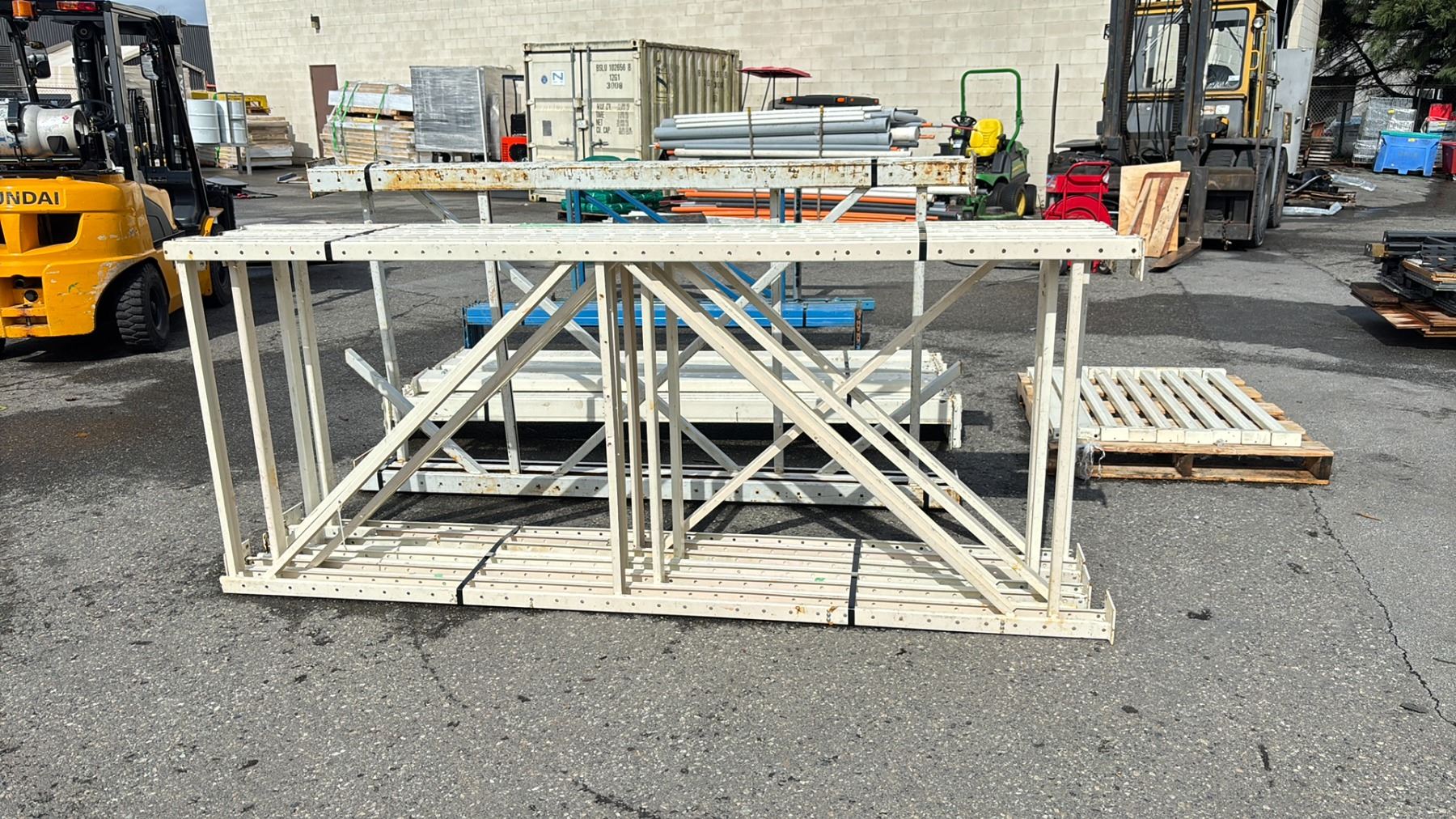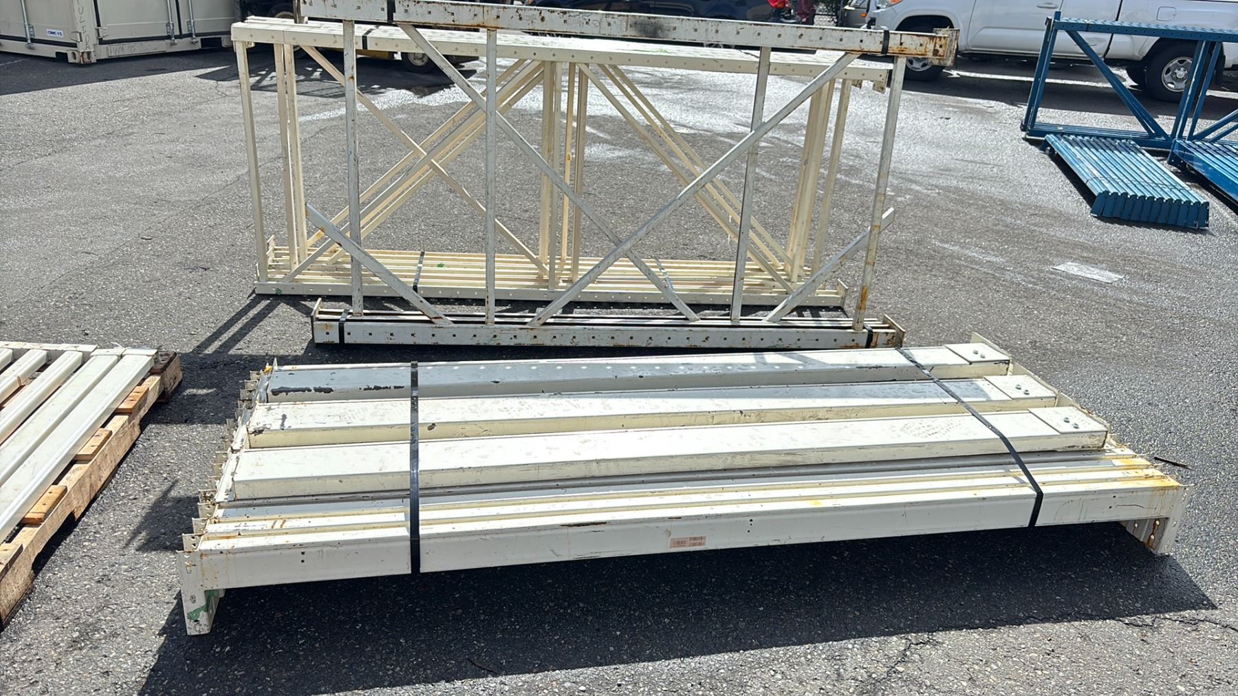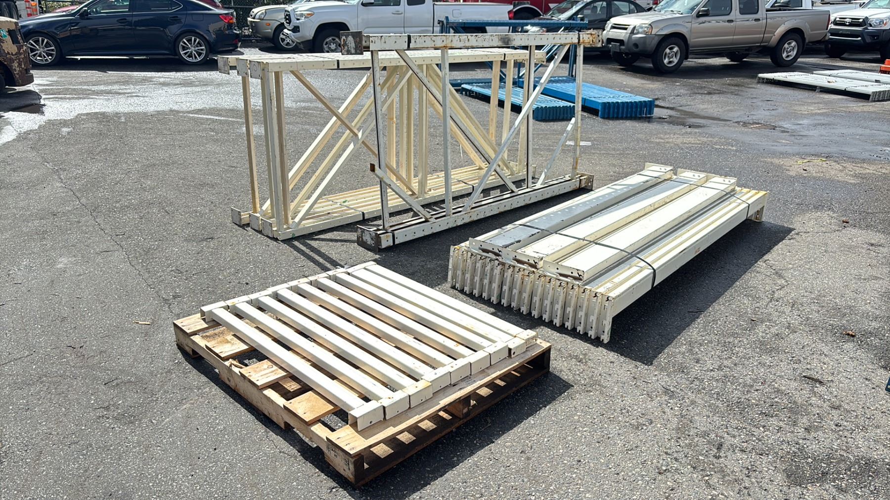 2 - 103"H X 42"W WHITE PALLET RACKING UPRIGHTS, 2 - 100"H X 42"W WHITE PALLET RACKING UPRIGHTS, 2 - 90"H X 42"W WHITE PALLET RACKING UPRIGHTS, 2 - 90"H X 49 1/2"W WHITE PALLET RACKING UPRIGHTS, 16 - 96"L X 4"W WHITE PALLET RACKING CROSSBARS, 3 - 91"L X 6"W WHITE PALLET RACKING CROSSBARS, 7 - 42"L X 2"W WHITE PALLET RACKING SUPPORTS & 2 - 42 1.2"L X 3"W WHITE PALLET RACKING SUPPORTS *DISMANTLED FOR TRANSPORTATION*