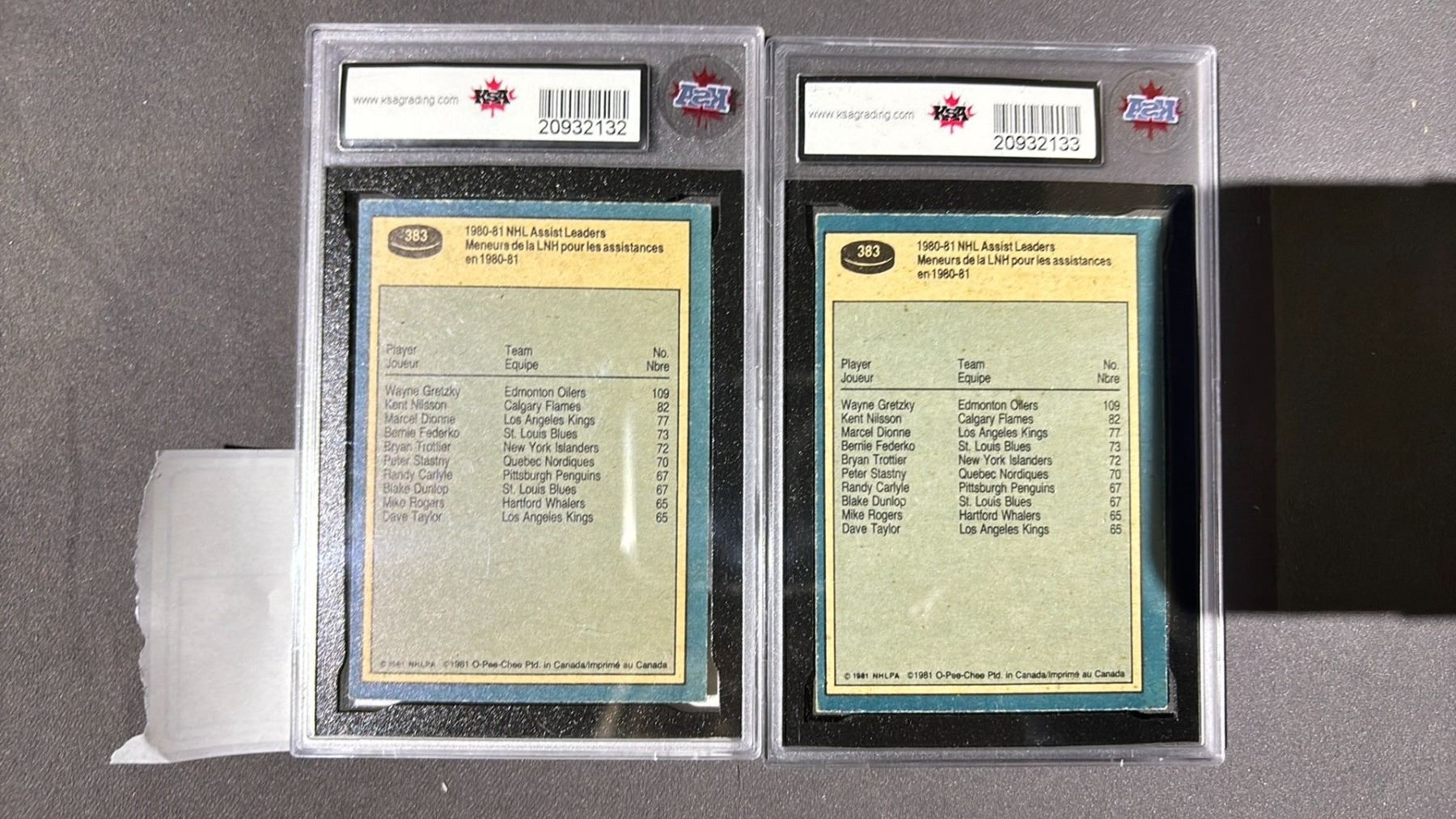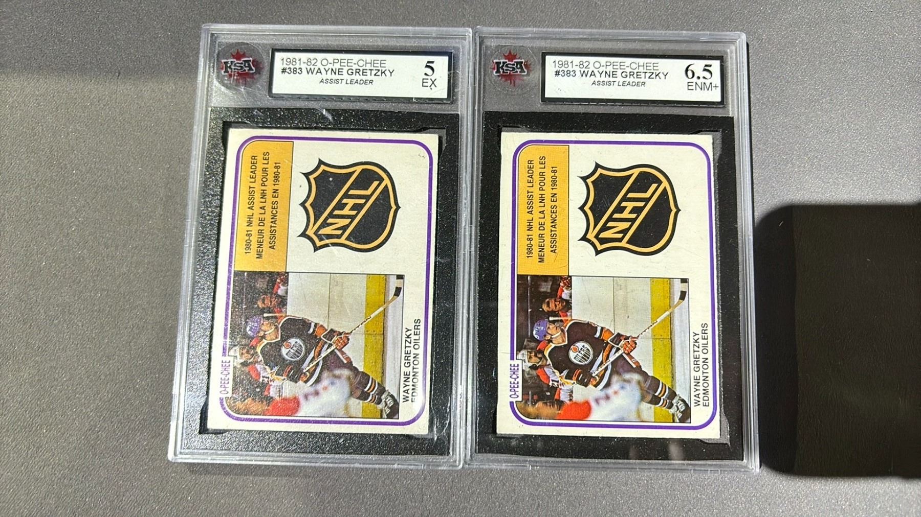 2 1981-1982 O-PEE-CHEE WAYNE GRETZKY ASSIST LEADER #383, KSA GRADED 6.5 & 5
