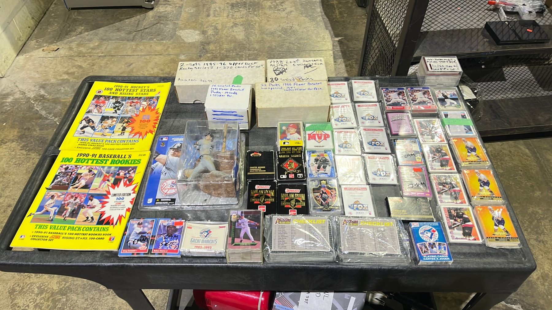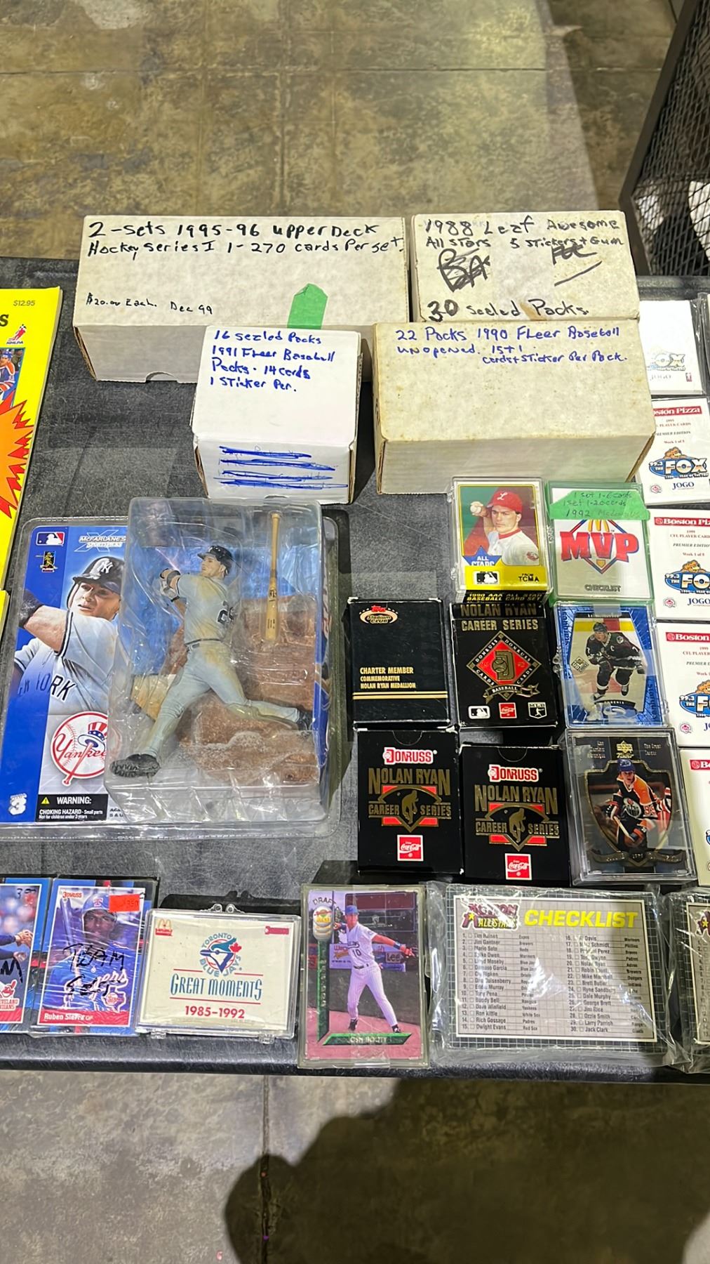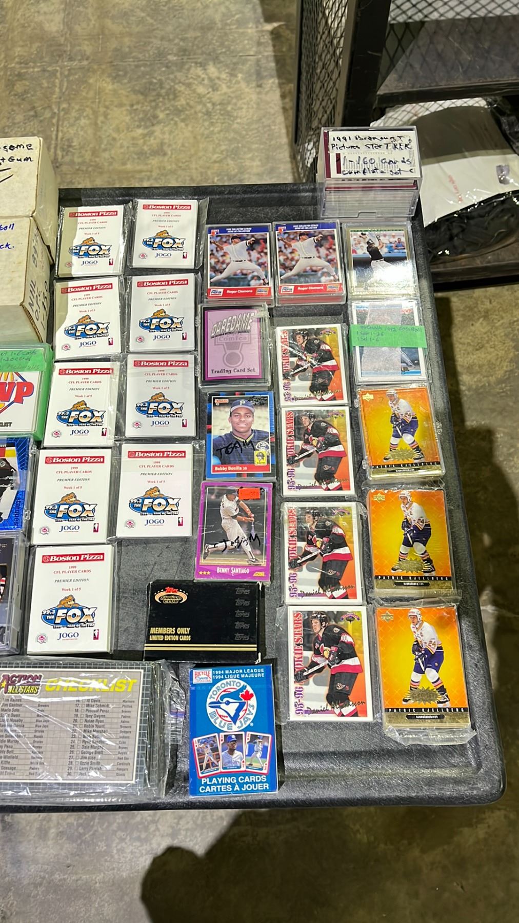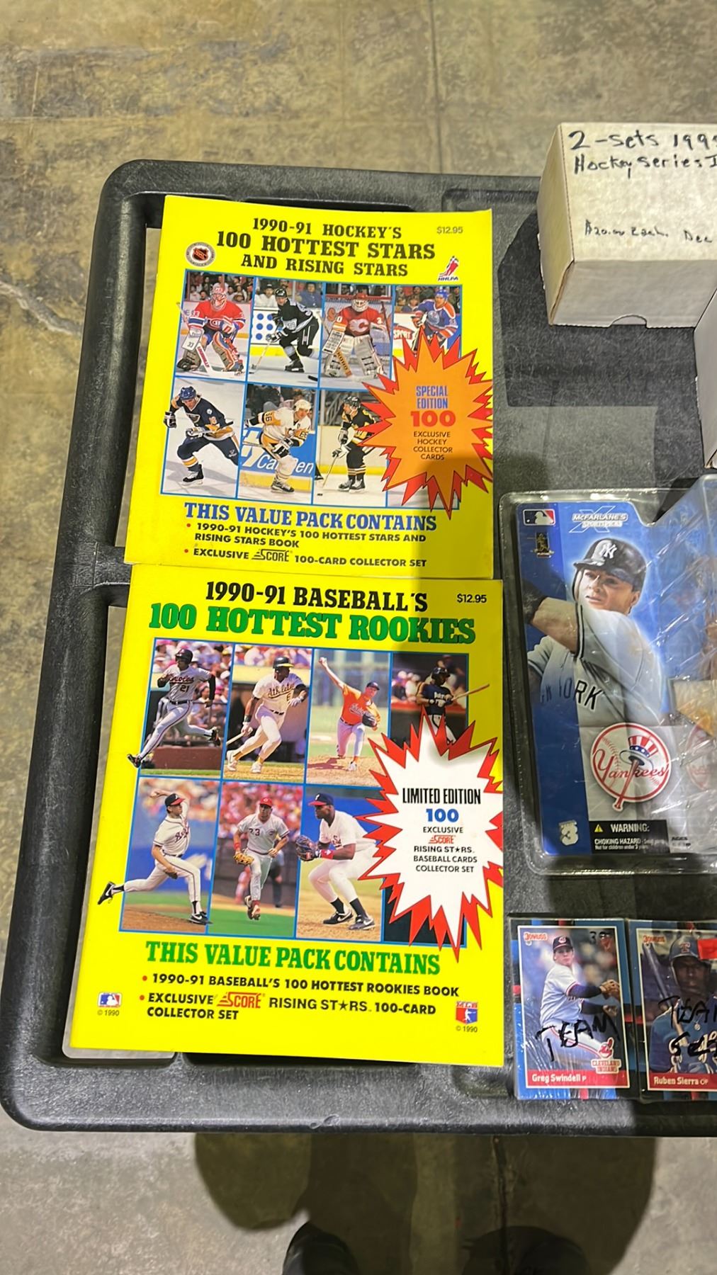2 1990-1991 SCORE BASEBALL HOTTEST ROOKIES BOOKS 1 2002 MCFARLANE'S SPORTS PICKS, JASON GIAMBI FIGURINE 1 1990 FLEER BASEBALL SET , 22 PACKS (FACTORY SEALED) 2 1995-1996 UPPER DECK HOCKEY SETS (COMPLETE) 2 1985 DONRUSS BASEBALL ACTIONS ALL STAR SETS (COMPLETE) 1 1991 FLEER BASEBALL SET, 16 PACKS (FACTORY SEALED) 1 1988 LEAF AWESOME ALL STARS SET, 30 PACKS (FACTORY SEALED) 1 1994 CLASSIC BASEBALL DRAFT PICKS SET, 1-100 (COMPLETE) 2 1992 PEPSI BASEBALL COLLECTOR SERIES SETS , 1-30 CARDS (COMPLETE) 9 BOSTON PIZZA CFL PLAYER CARD SETS, WEEKS 1-5 3 1992 LEAF COCACOLA NOLAN RYAN CAREER SERIES SETS (FACTORY SEALED) 1 1990 TOPPS STADIUM CLUB NOLAN RYAN COMMEMORATIVE MEDALLION 1 1992 MCDONALDS BASEBALL SET, CARDS 1-20 AND CARDS 1-6 (COMPLETE) 1 1990 AAA ALL STAR BASEBALL SET, 45 CARDS (COMPLETE) 1 1998-1999 UPPER DECK STAR QUEST HOCKEY SET, 1-30 CARDS (COMPLETE) 1 1999 UPPER DECK RETRO HOCKEY SET, 1-40 CARDS (COMPLETE) 1 1988 DONRUSS BASEBALL RANGERS TEAM SET (COMPLETE) 1 1988 SCORE BASEBALL PADRES TEAM SET (COMPLETE) 1 1988 DONRUSS BASEBALL TEAM SET (COMPLETE) 1 1994 BICYCLE BASEBALL TORONTO BLUE JAYS PLAYING CARDS SET (FACTORY SEALED) 1 1988 DONRUSS BASEBALL CLEVELAND INDIANS TEAM SET (COMPLETE) 1 1993 PERSONALITY COMICS INC. SET, 1-36 CARDS (COMPLETE) 1 1991 TOPPS STADIUM CLUB BASEBALL SET, 1-20 CARDS (COMPLETE) 1 1991 PARAMOUNT PICTURES STAR TRECK SET, 1-160 CARDS (COMPLETE) 3 1997 UPPER DECK HOCKEY, YOU CRASH THE GAME SET, 1-30 CARDS (COMPLETE) 1 1993 DONRUSS MCDONALDS BLUE JAYS GREAT MOMENTS SET, 1-36 CARDS, 1985-1992 1 1993 O-PEE-CHEE BASEBALL STAR PERFORMERS SET, 1-22 CARDS (COMPLETE) 1 1992 DONRUSS MVP BASEBALL SET, 1-26 AND 1-6 CARDS (COMPLETE) 4 1996-1997 TOPPS HOCKEY DRAFT PICKS SETS, 1-18 CARDS PER SET (FACTORY SEALED)