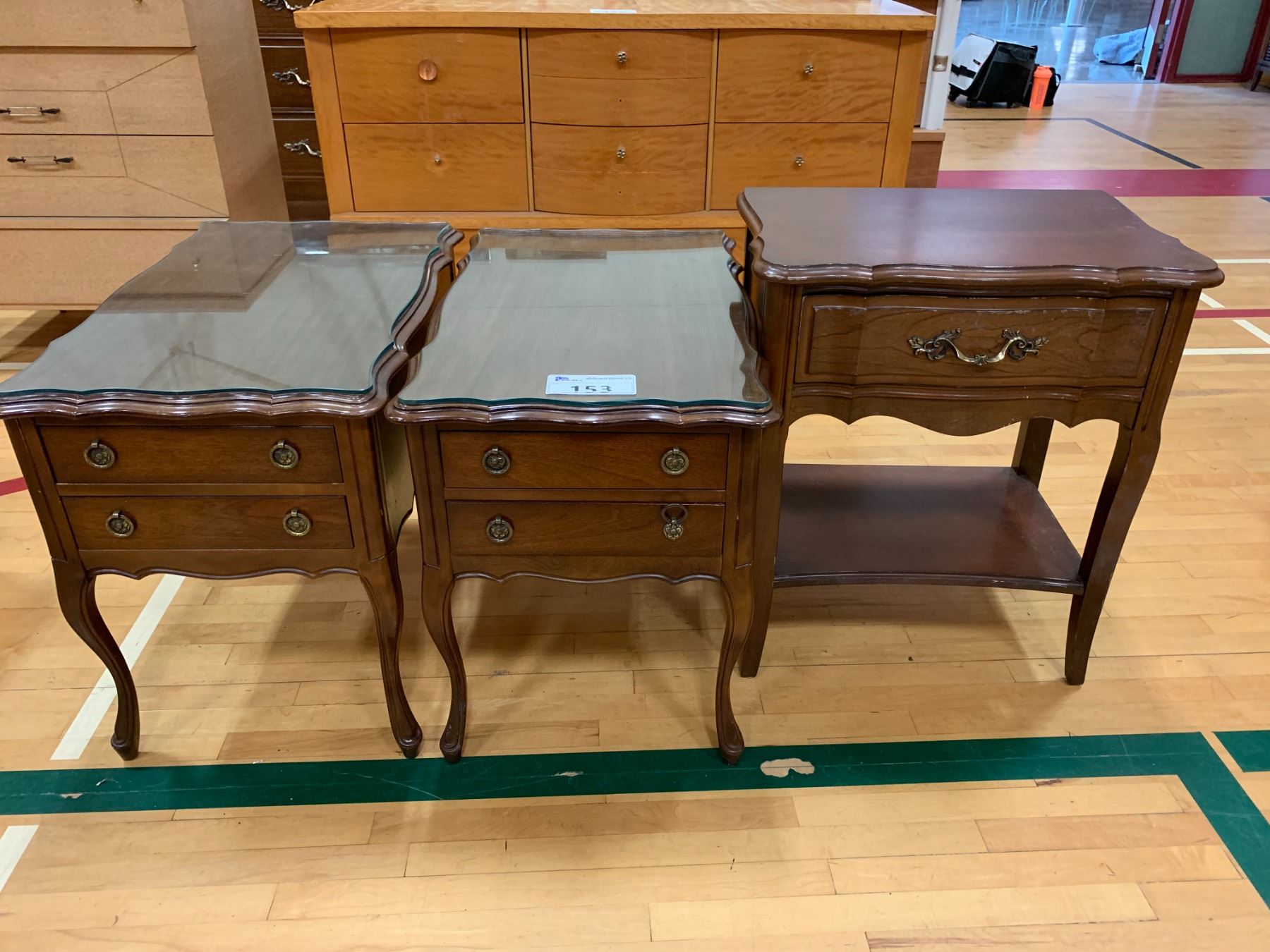 2 2 DRAWER GLASS TOP WOOD END TABLES APPROX 22"X18"X28" & 1 DRAWER WOOD NIGHT STAND APPROX 26"X22"15"
