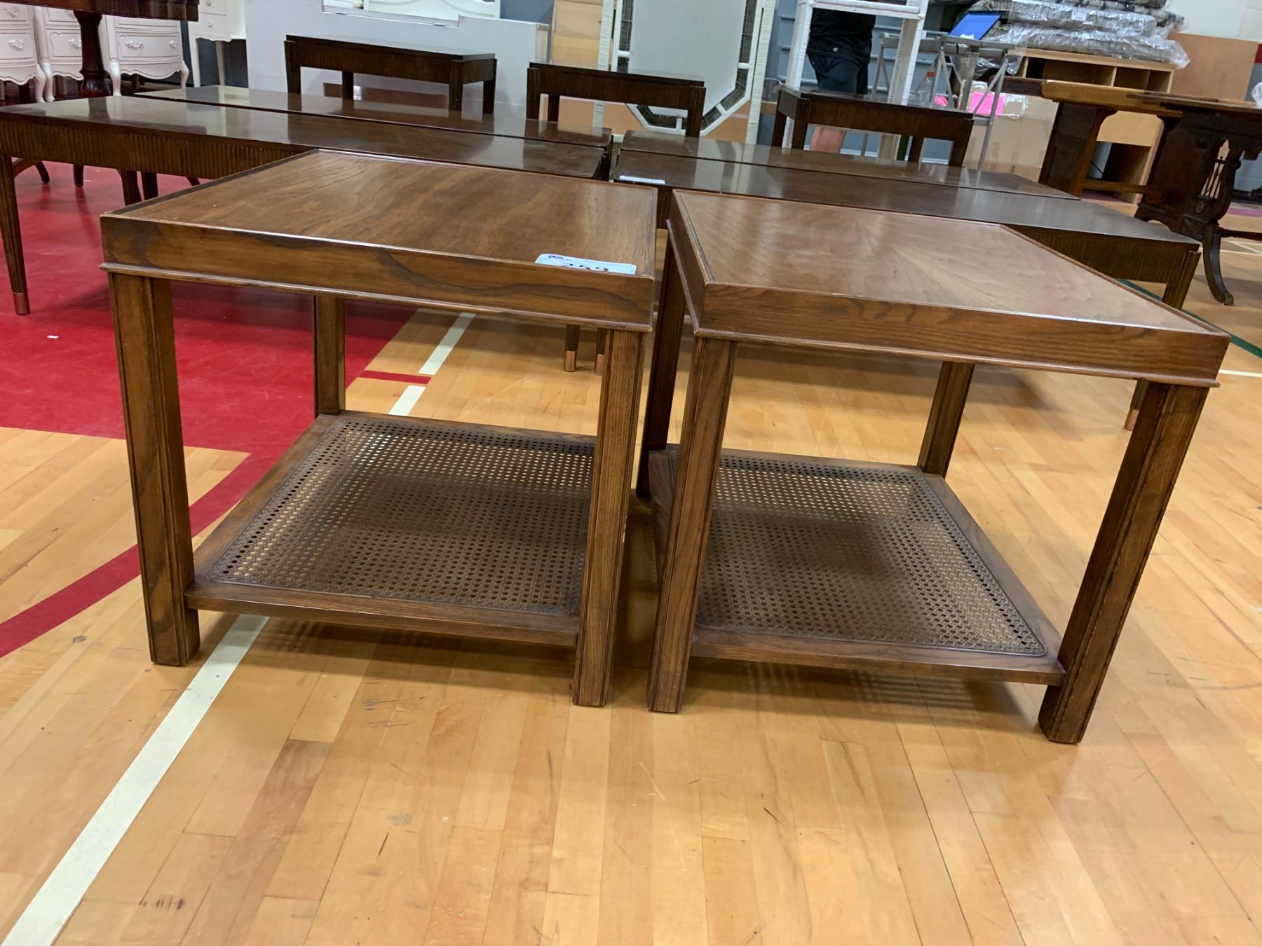 2 2 TIER WOOD & WHICKER END TABLES APPROX 21"X25"X22"