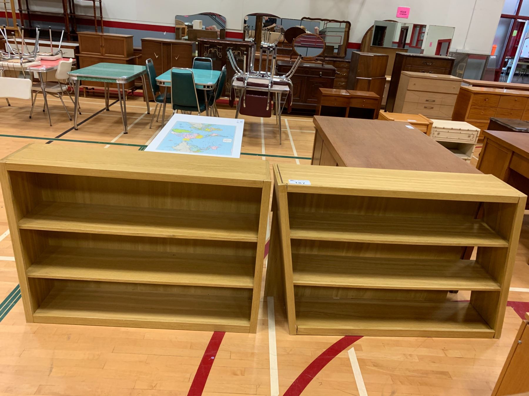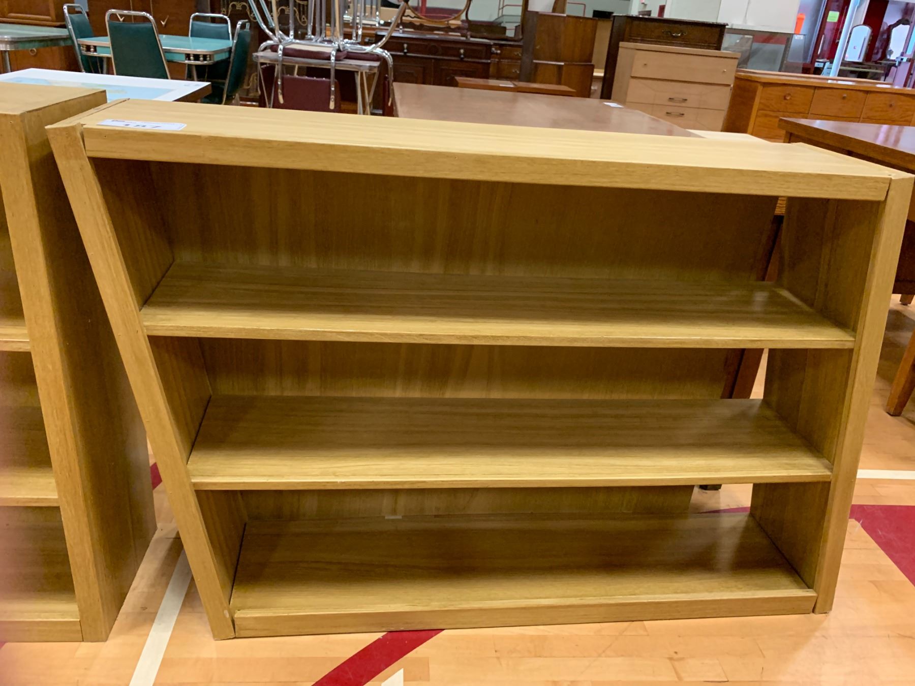 2 3 WOOD SHELVING UNITS (1 DAMAGED ON BACK, DOES NOT STAND STRAIGHT) APPROX 36"X48"X12"